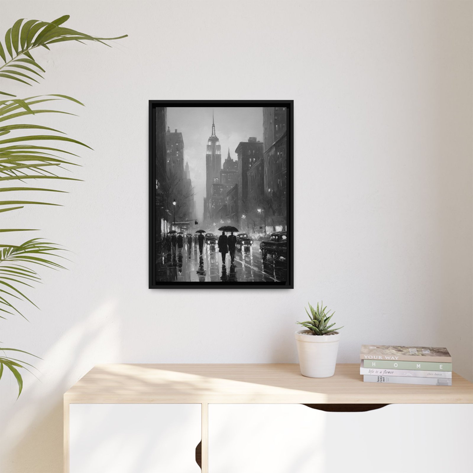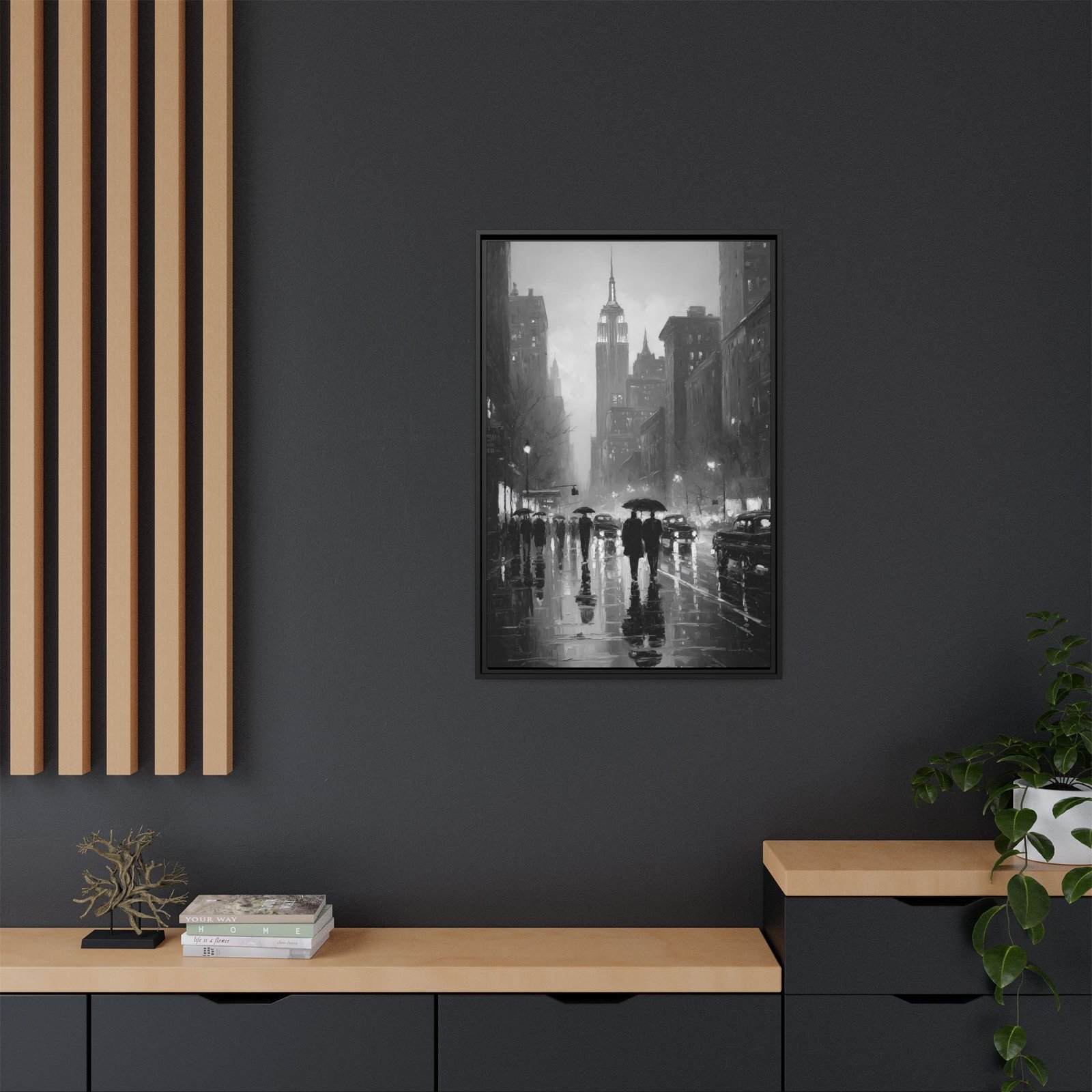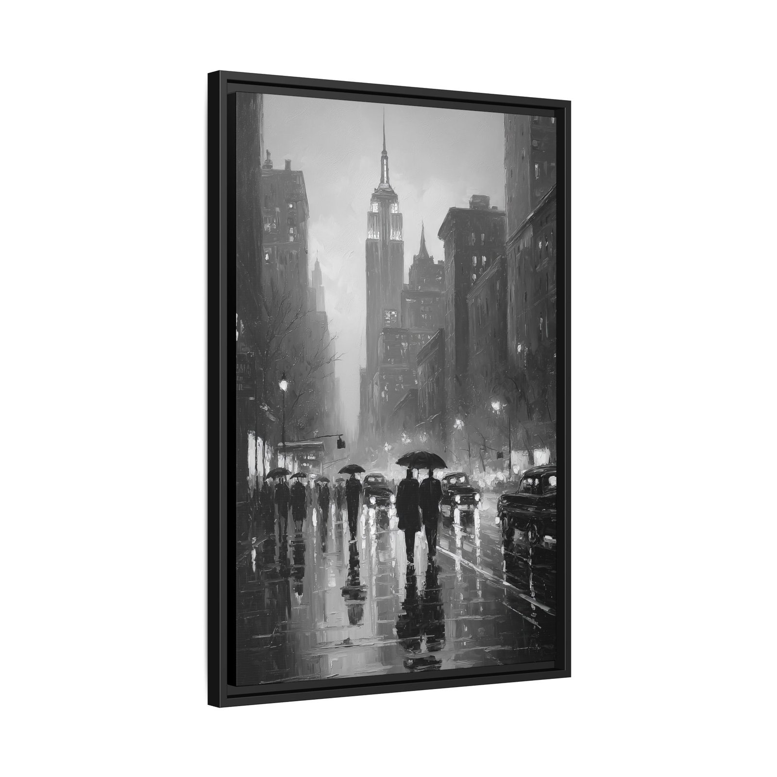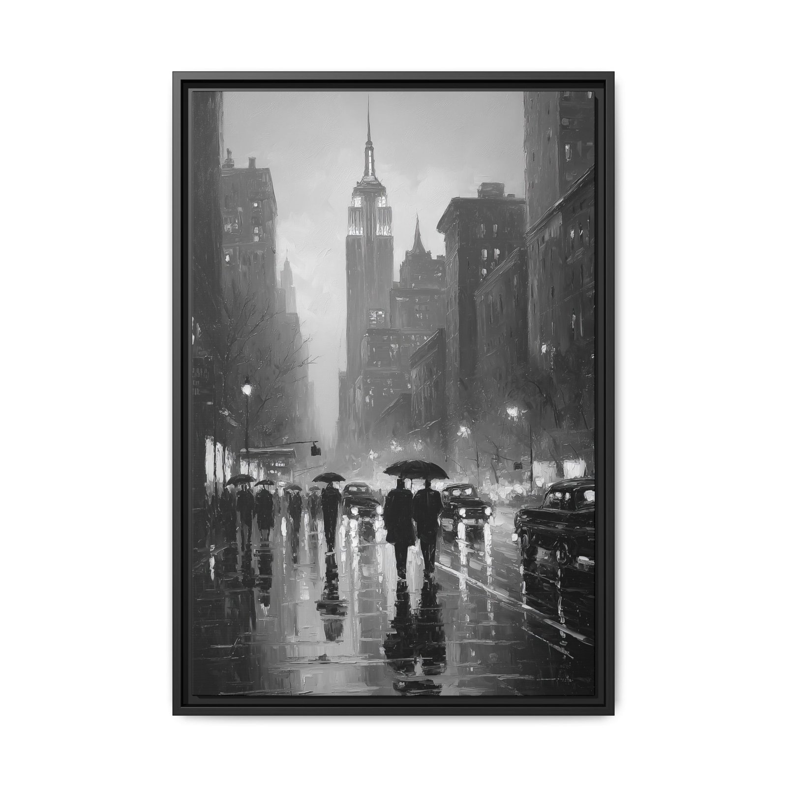 This black and white New York City wall art captures a cinematic rainy evening beneath the iconic skyline, with the Empire State Building rising through mist and city lights. Reflections shimmer across wet pavement as silhouetted figures walk beneath umbrellas, creating a timeless urban atmosphere.