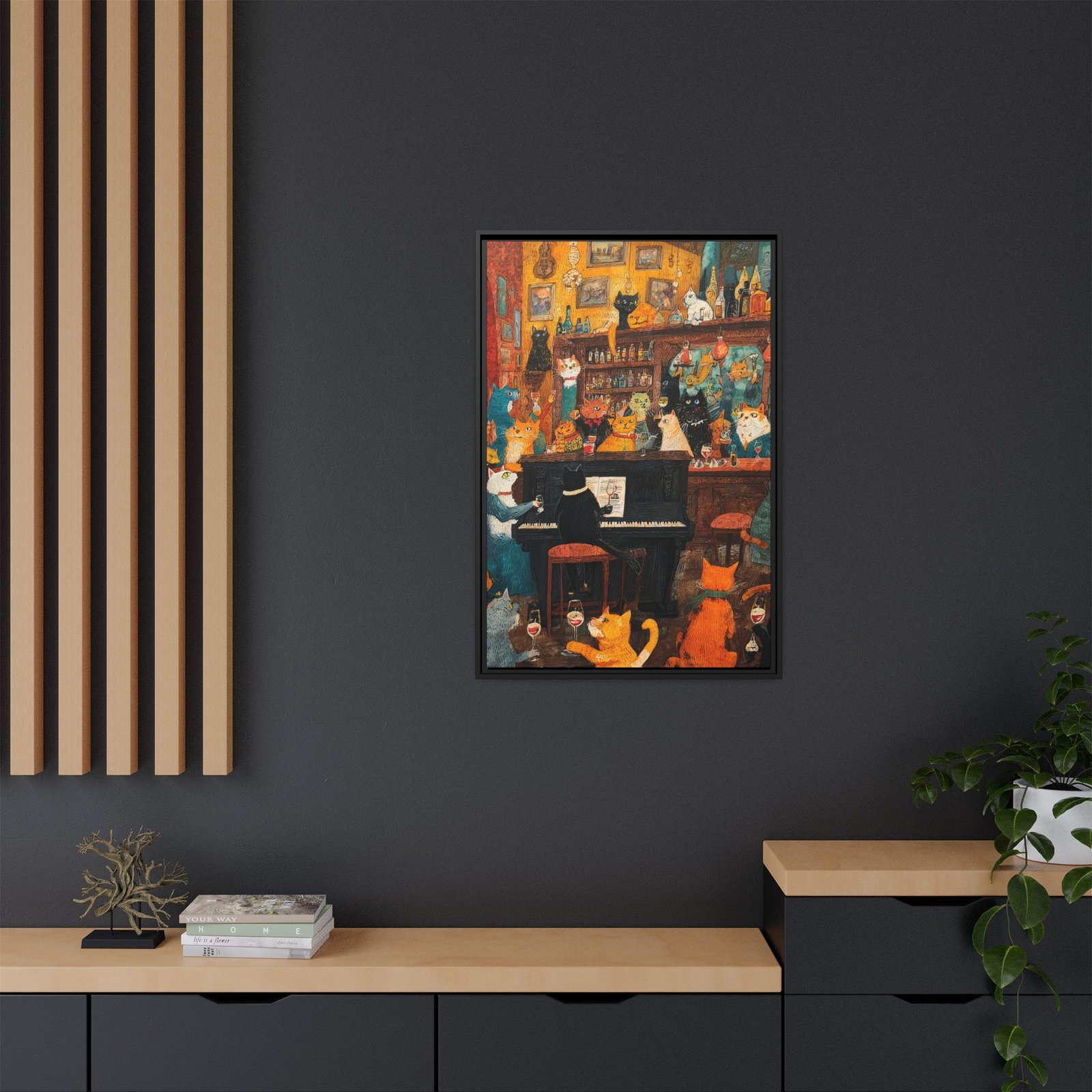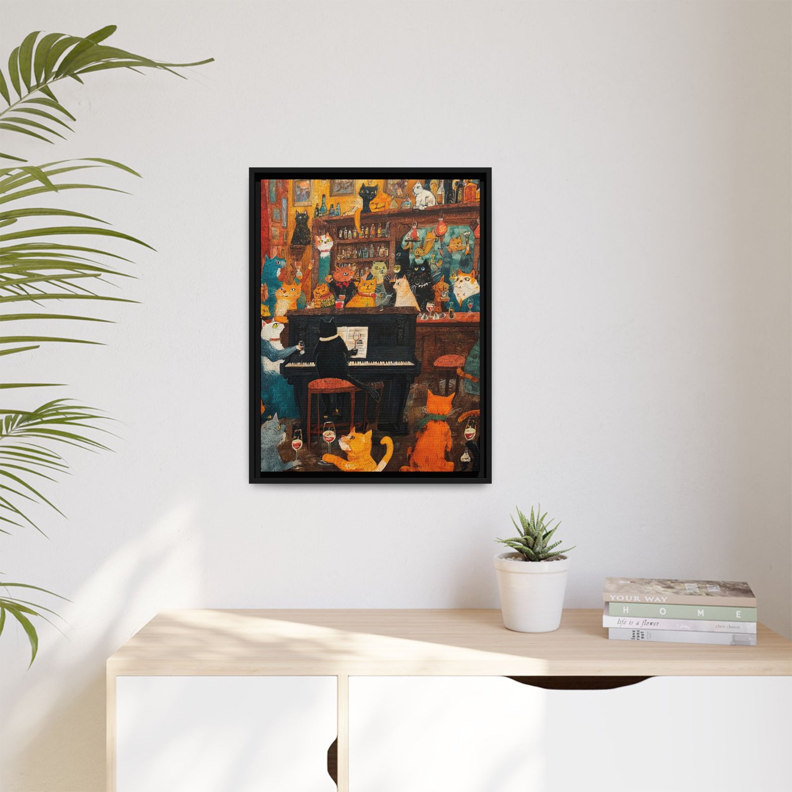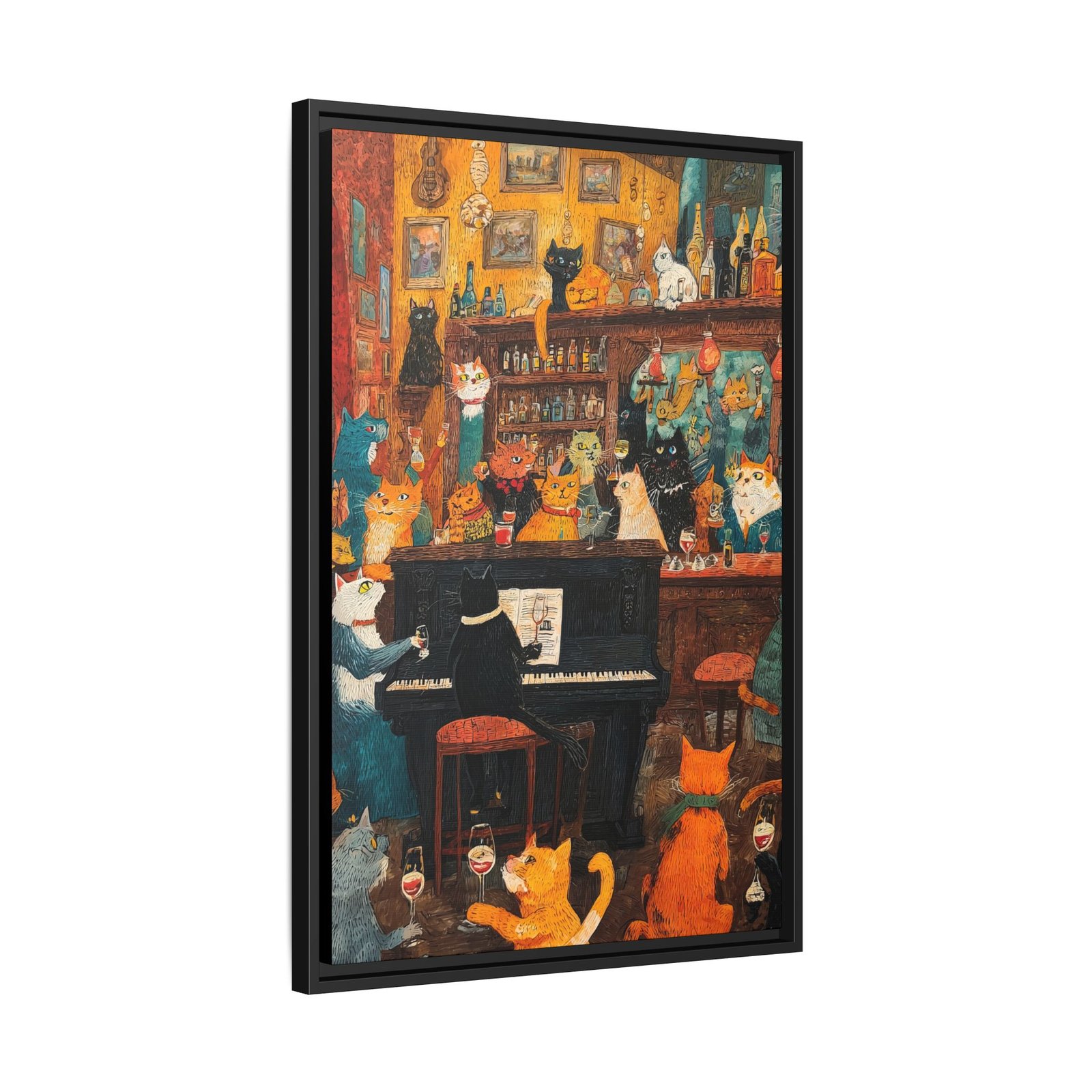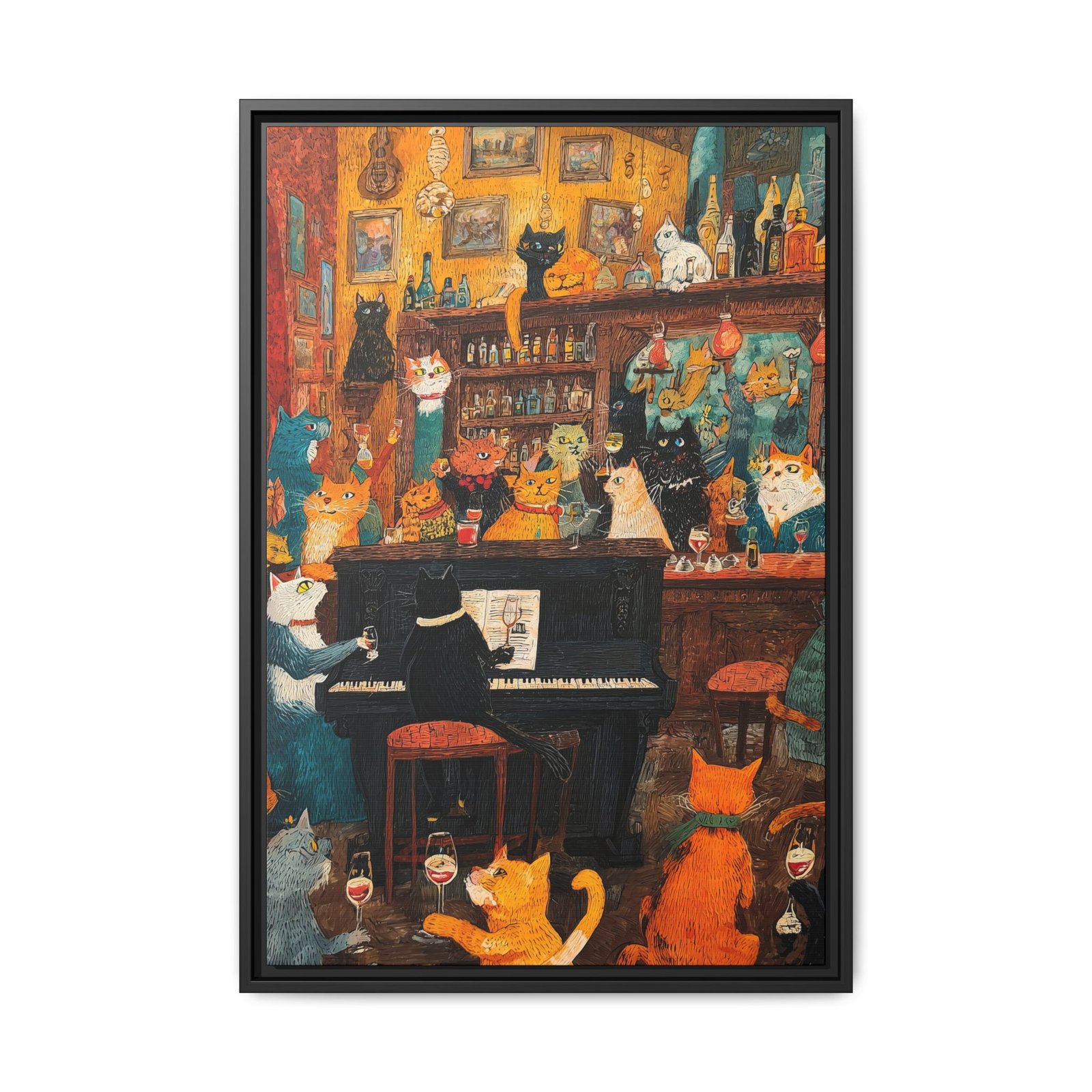 This lively cats piano bar wall art brings together charm, humor, and rich storytelling in a vibrant tavern setting filled with expressive feline characters. The scene captures a cozy bar atmosphere where cats gather around a piano, enjoying drinks, conversation, and music. Each character is uniquely styled, creating a dynamic and engaging composition that draws the viewer into the moment.
