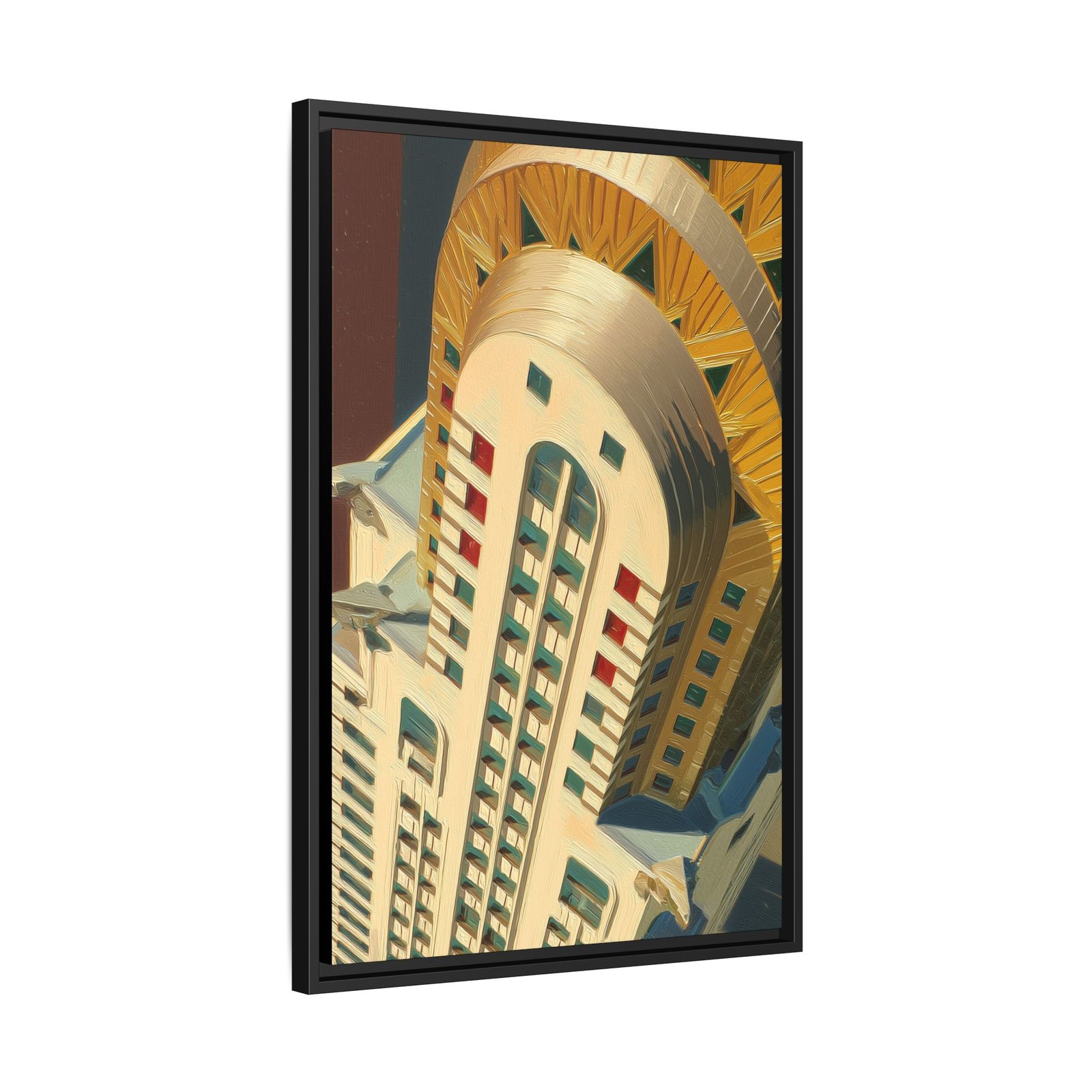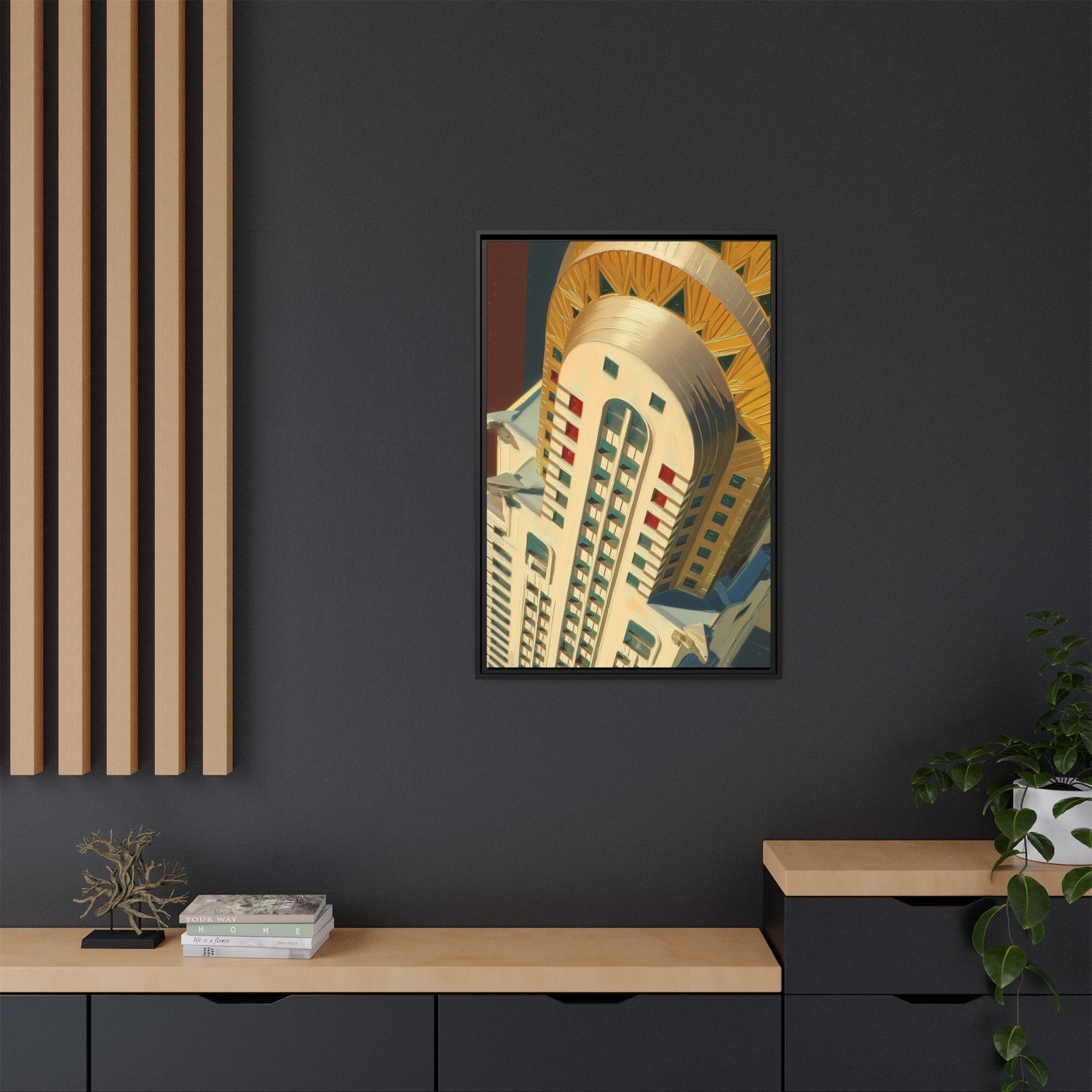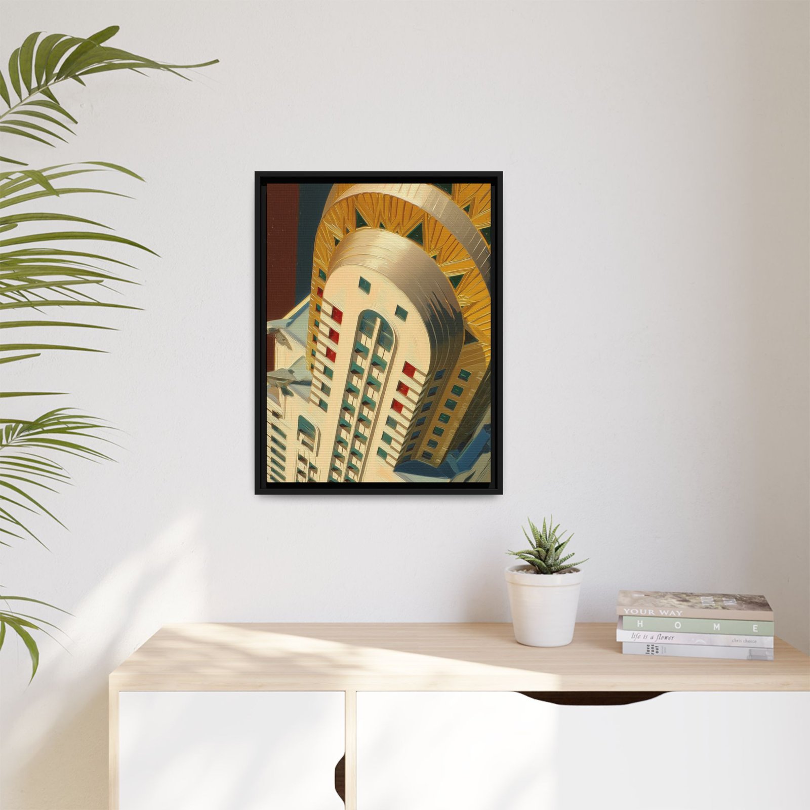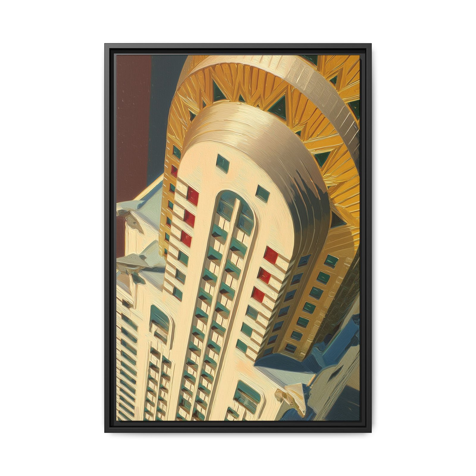 Rendered in a painterly style, the artwork softens the structure just enough to bring out texture and depth while preserving its bold architectural presence. The warm golds and subtle accents create a refined, vintage-modern feel that fits well in contemporary or design-focused interiors.