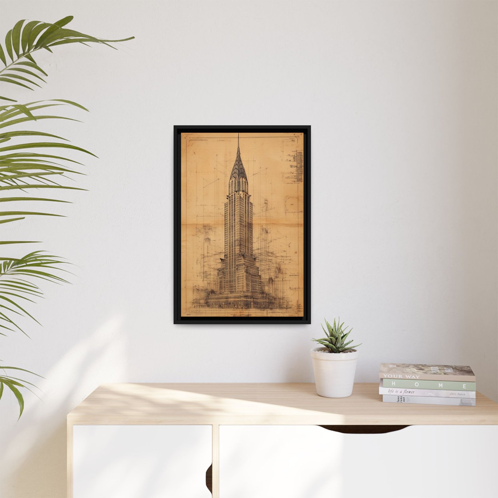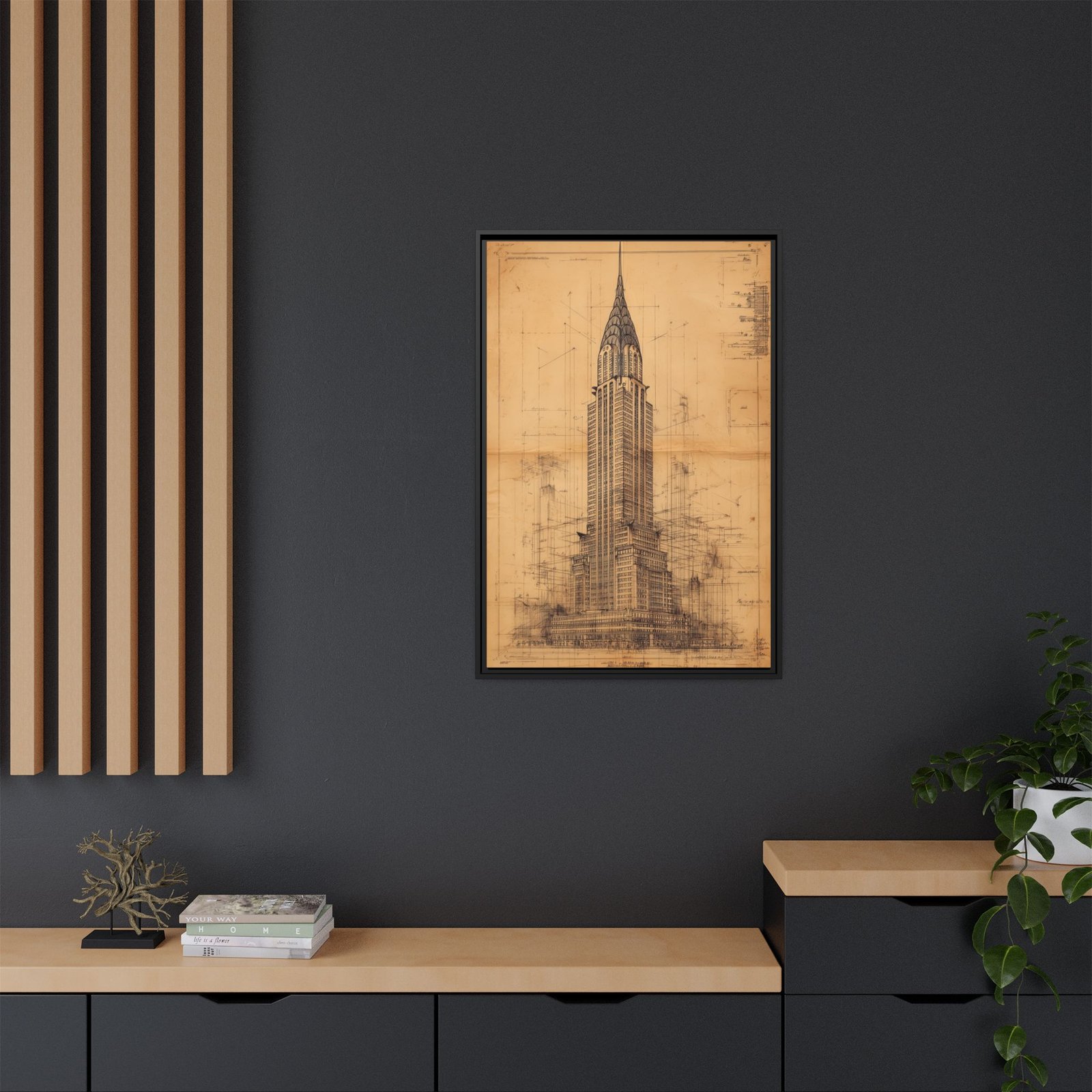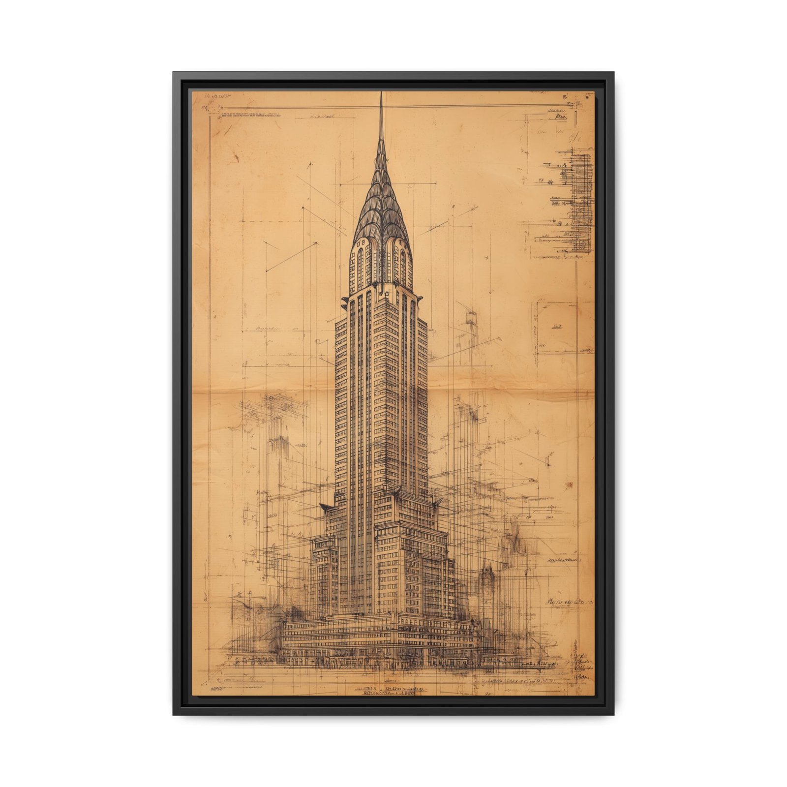 The blueprint-style background creates an immersive sense of craftsmanship, as if the building is unfolding right out of its original plans — not just a finished landmark, but a work of vision and ambition. Ideal for lovers of classic New York architecture, Art Deco design, engineering history, or vintage drafting aesthetics, this piece brings a timeless sophistication to any setting.