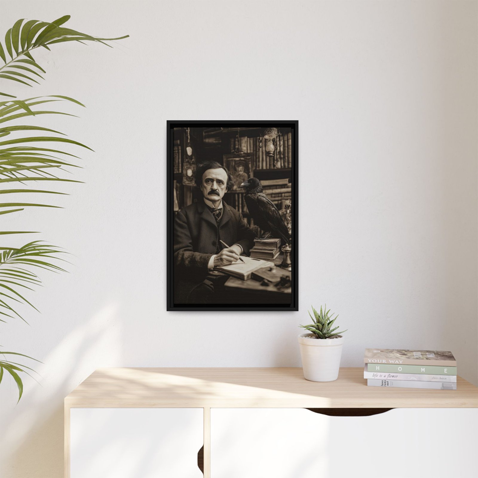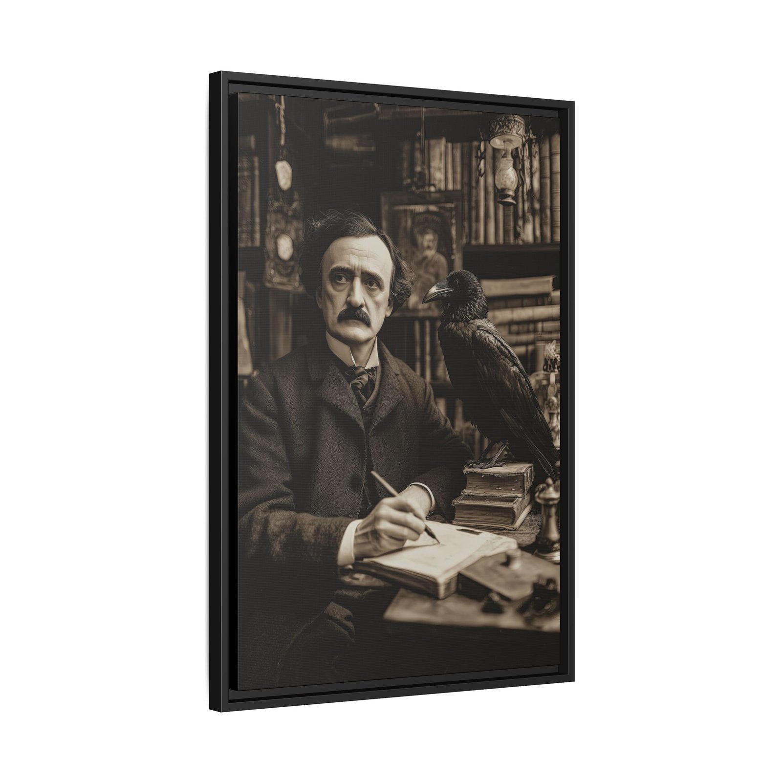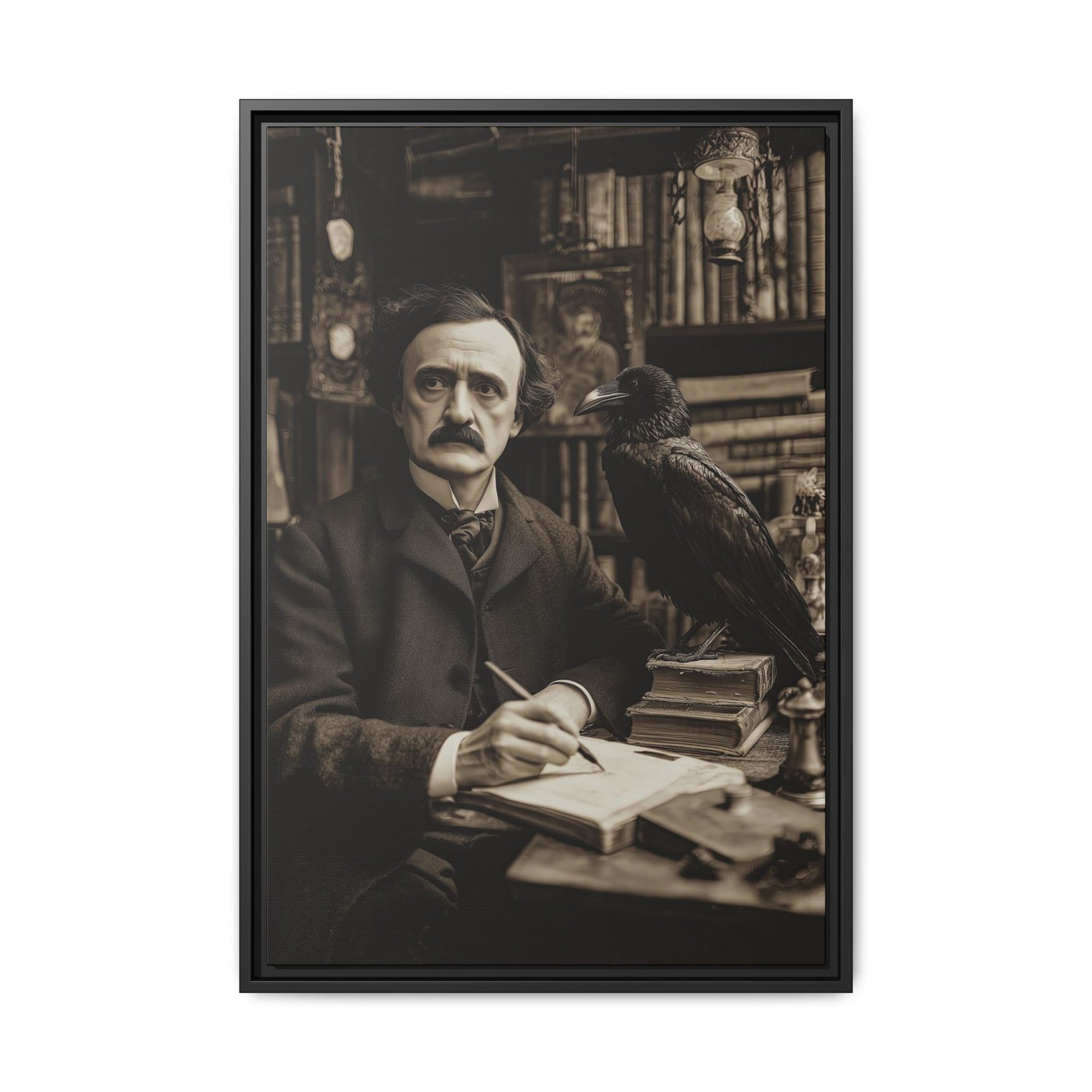 This Edgar Allan Poe raven wall art captures a timeless literary scene, featuring the iconic writer seated at his desk with a raven perched beside him. Rendered in a vintage, sepia-toned style, the composition evokes a quiet, contemplative atmosphere filled with books, shadows, and classic detail.