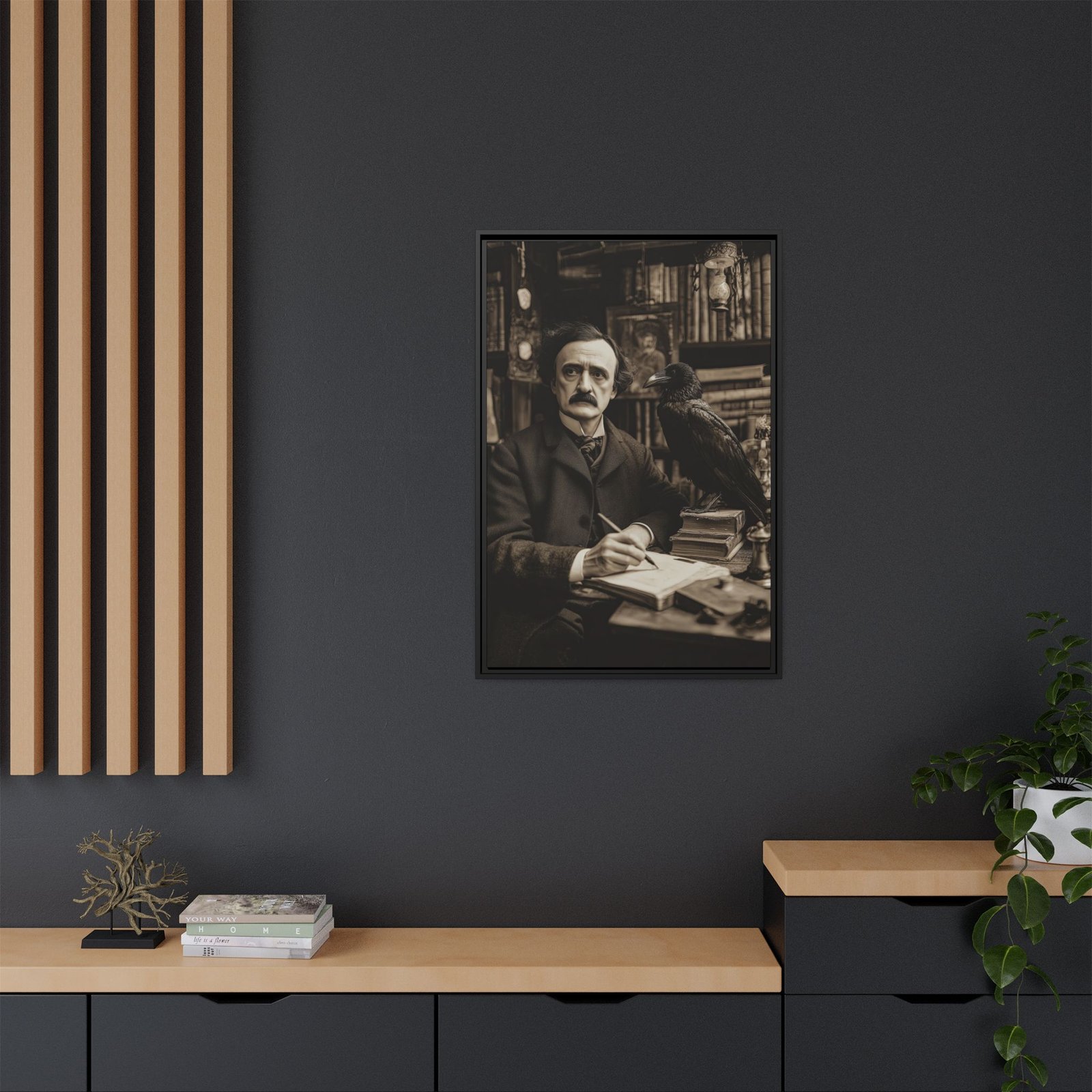 The rich textures and antique aesthetic give the piece a strong dark academia and gothic presence, making it an ideal addition to libraries, reading rooms, or moody interiors. The pairing of Poe and the raven creates an instantly recognizable and atmospheric focal point.