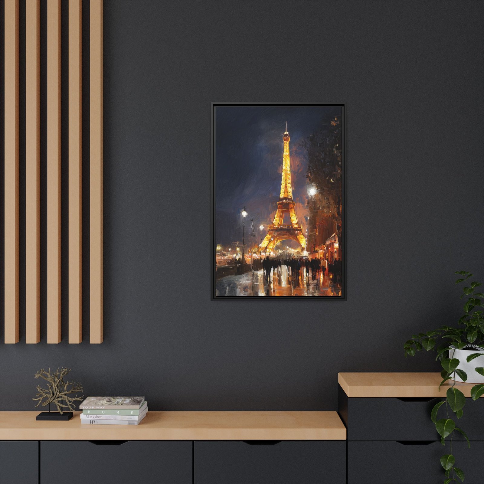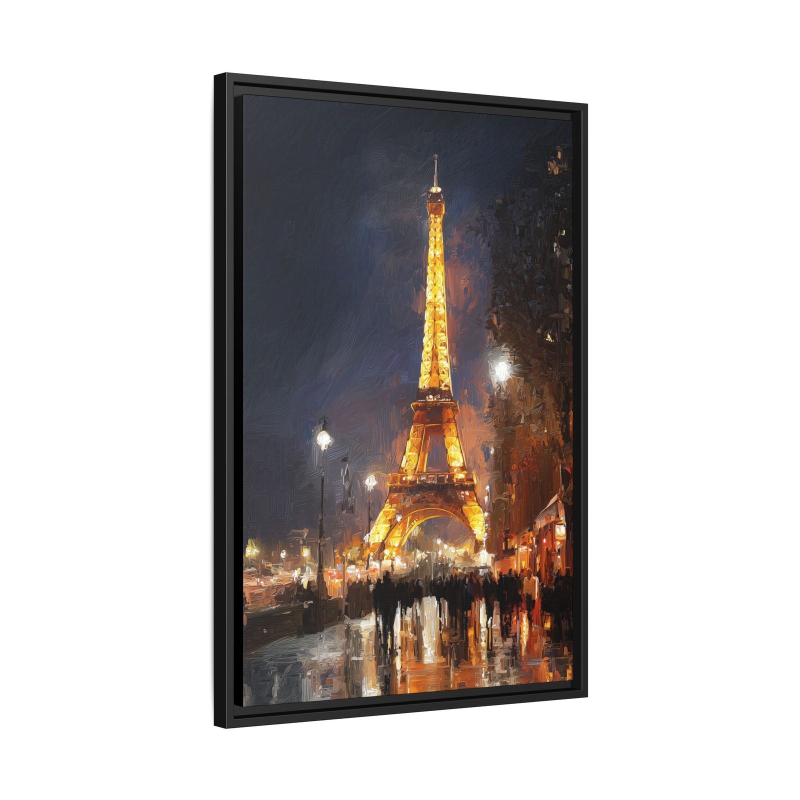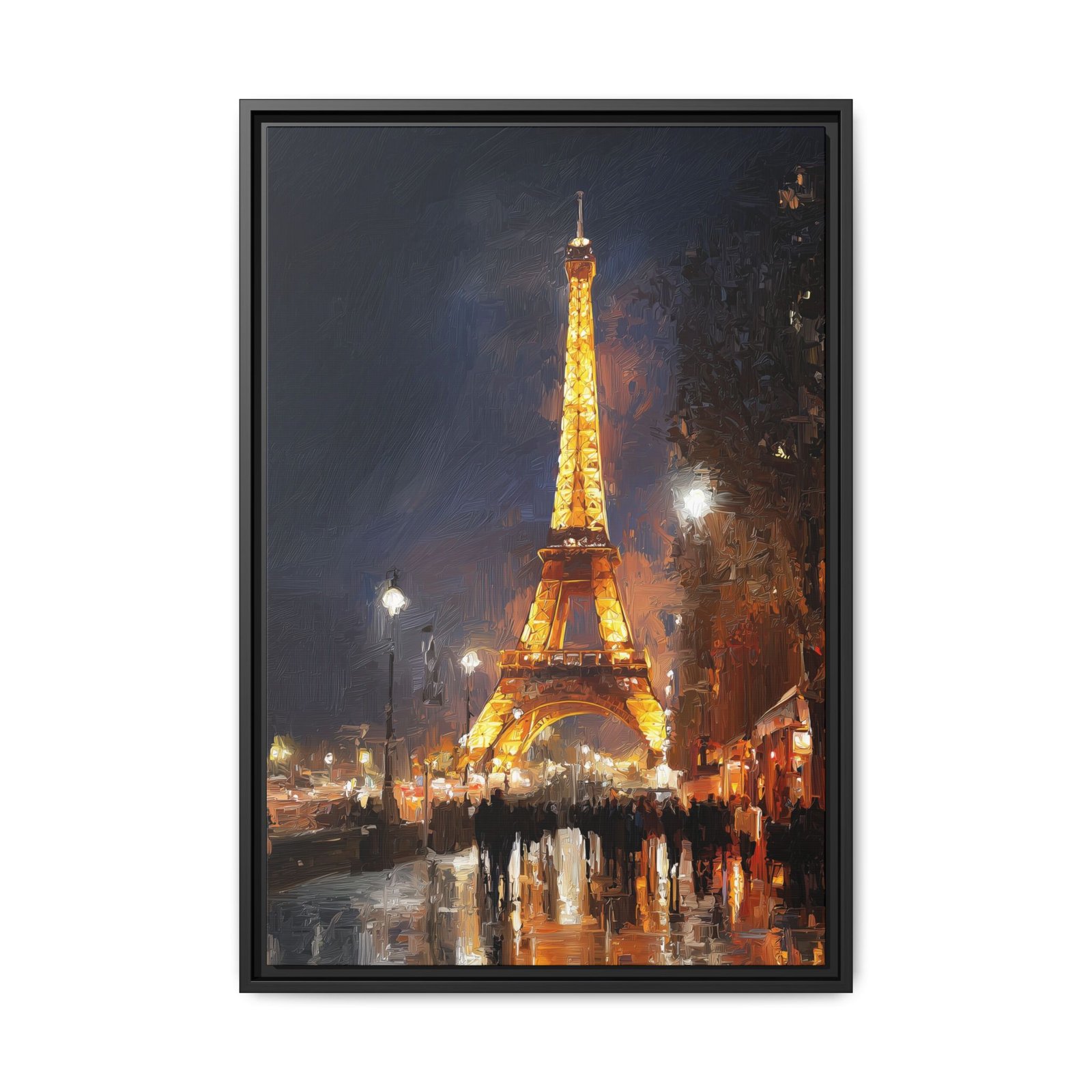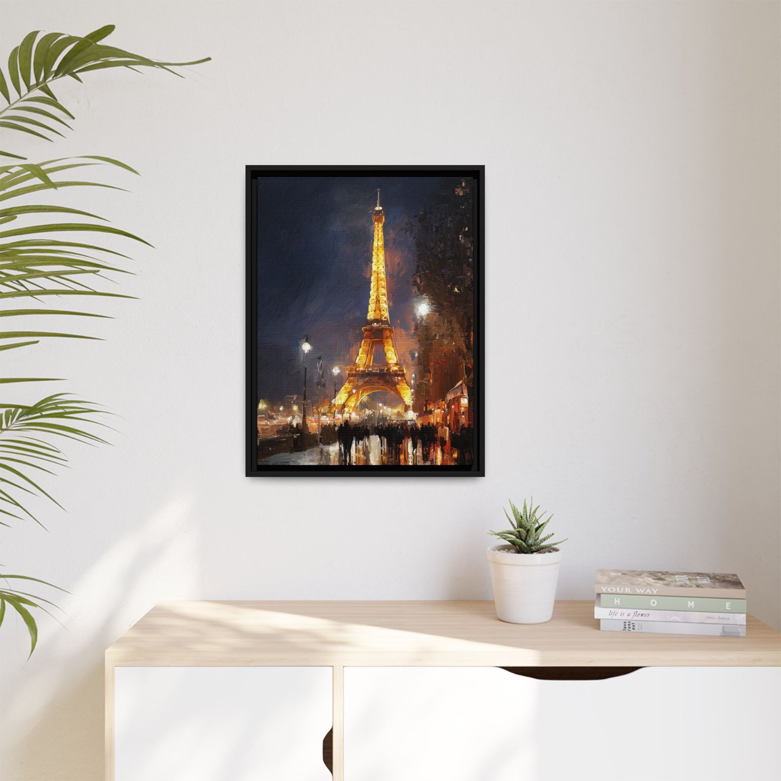 This Eiffel Tower wall art showcases the iconic Paris landmark illuminated against the night sky, rendered in a textured, painterly style. Warm golden lights reflect off the wet streets below, while soft brushstrokes capture the movement of the city and the glow of street lamps.