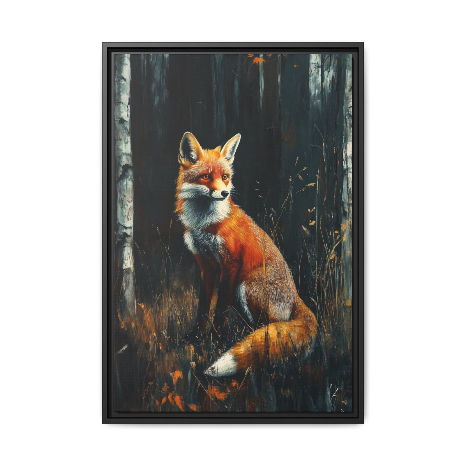Bring the beauty of the wild into your space with this fox in forest wall art. This detailed piece captures a vivid red fox set against a dark, moody woodland backdrop, creating a strong contrast between warm fur tones and cool forest shadows.