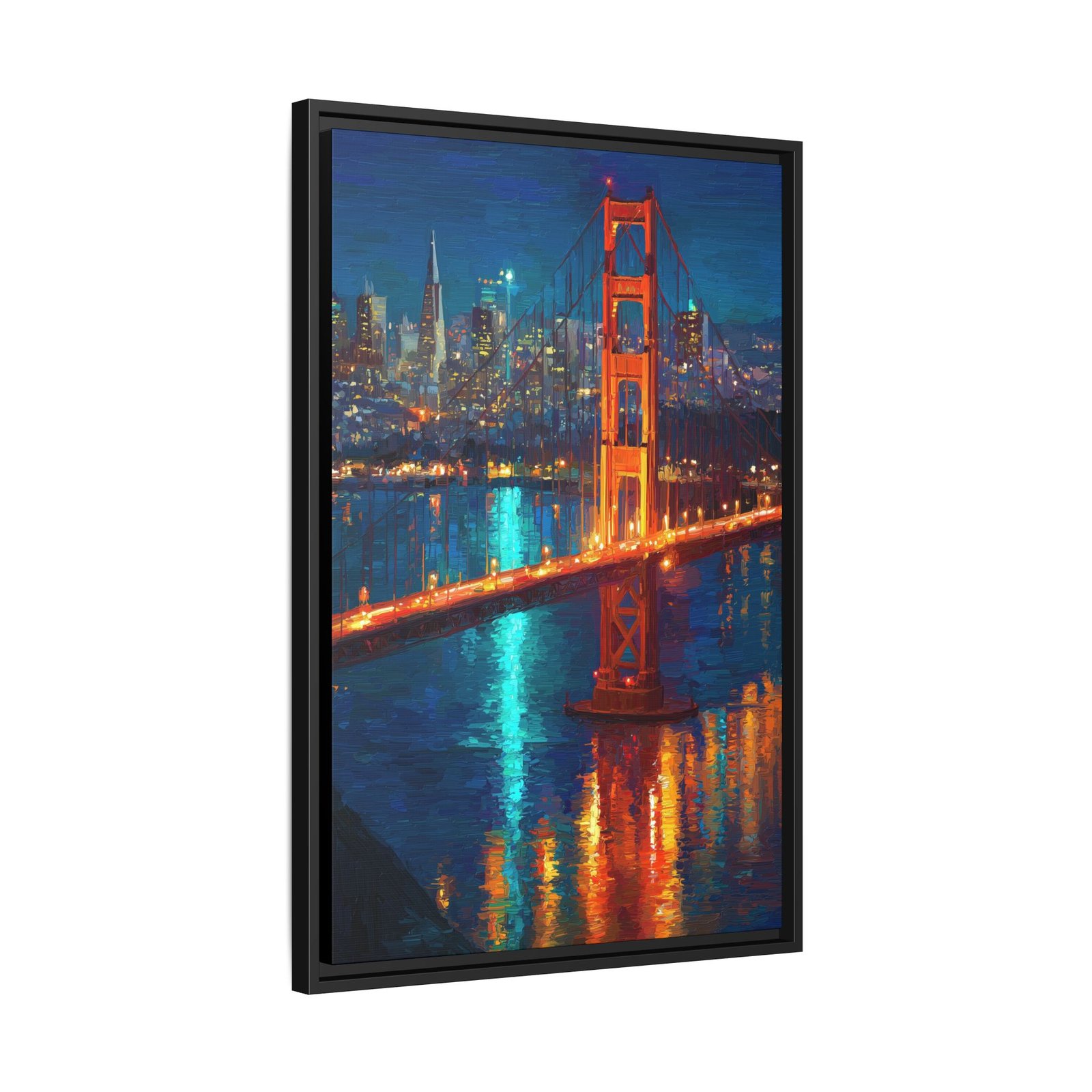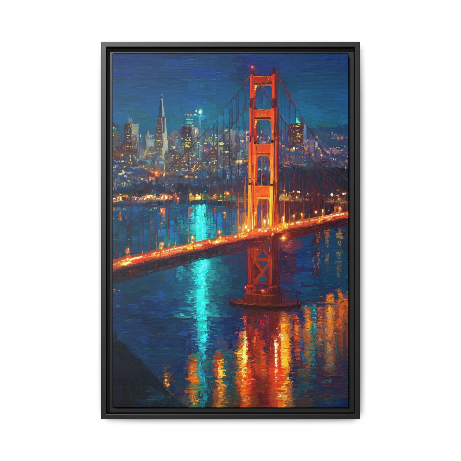 This Golden Gate Bridge wall art captures the iconic San Francisco landmark illuminated at night, rendered in a bold, painterly style. The warm orange tones of the bridge contrast beautifully with the deep blues of the water and sky, while reflections shimmer across the surface below.