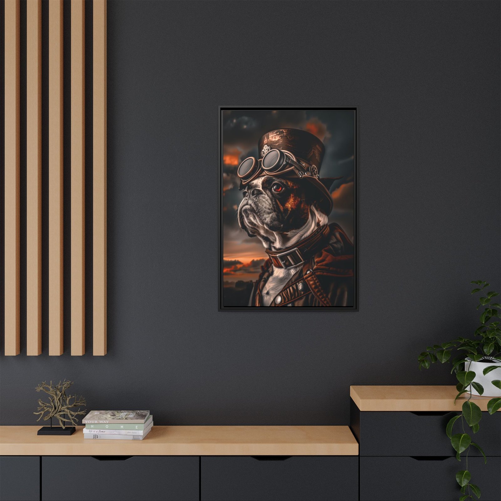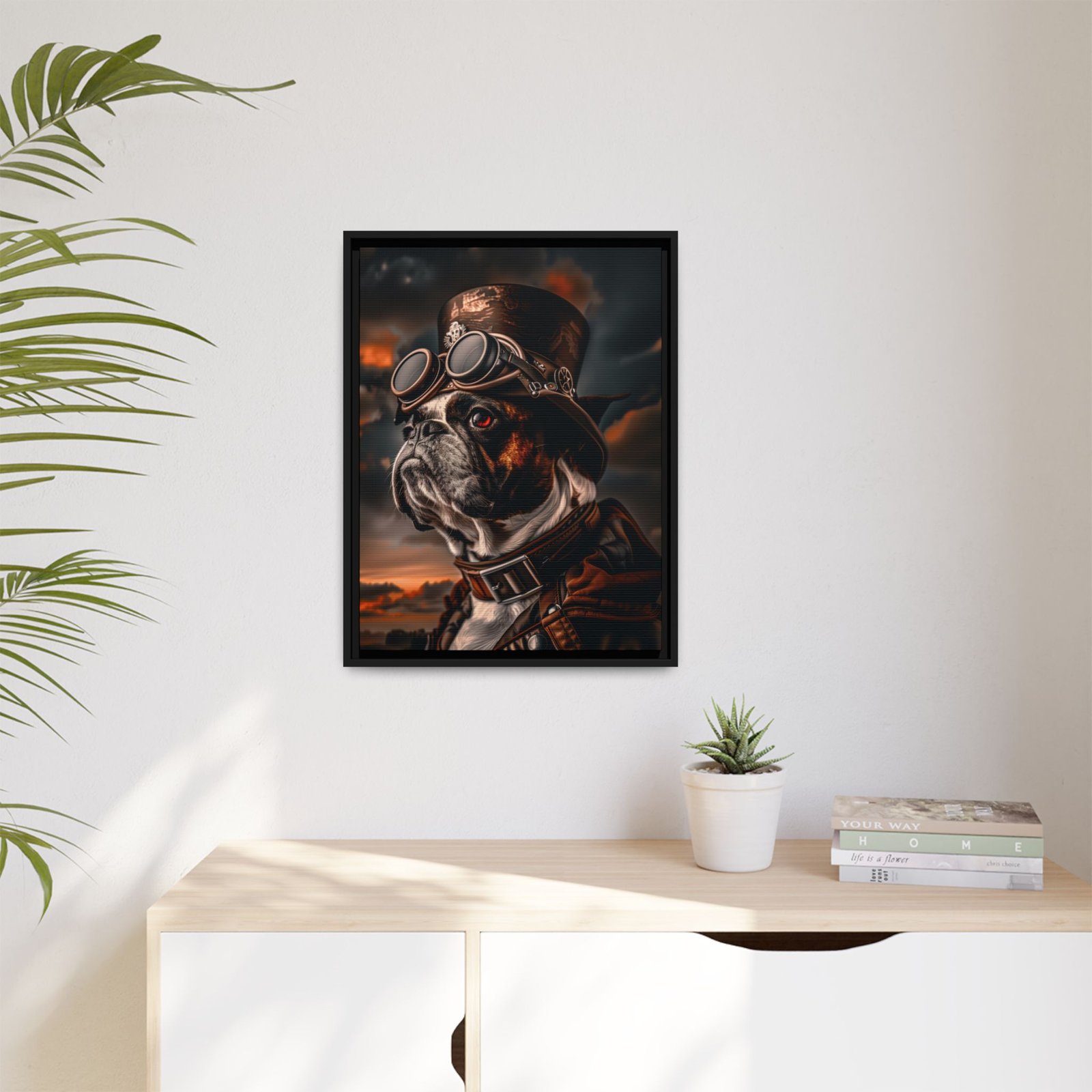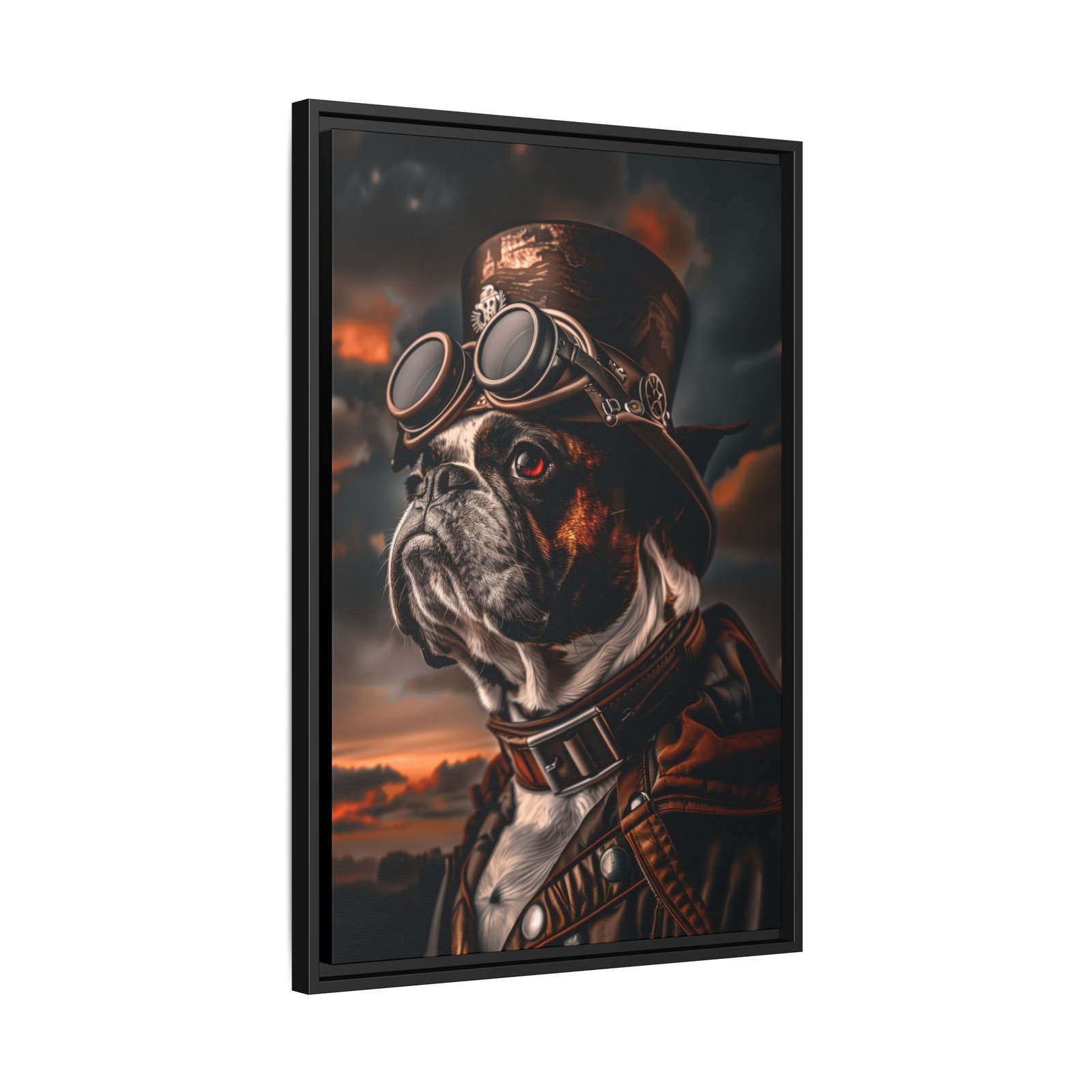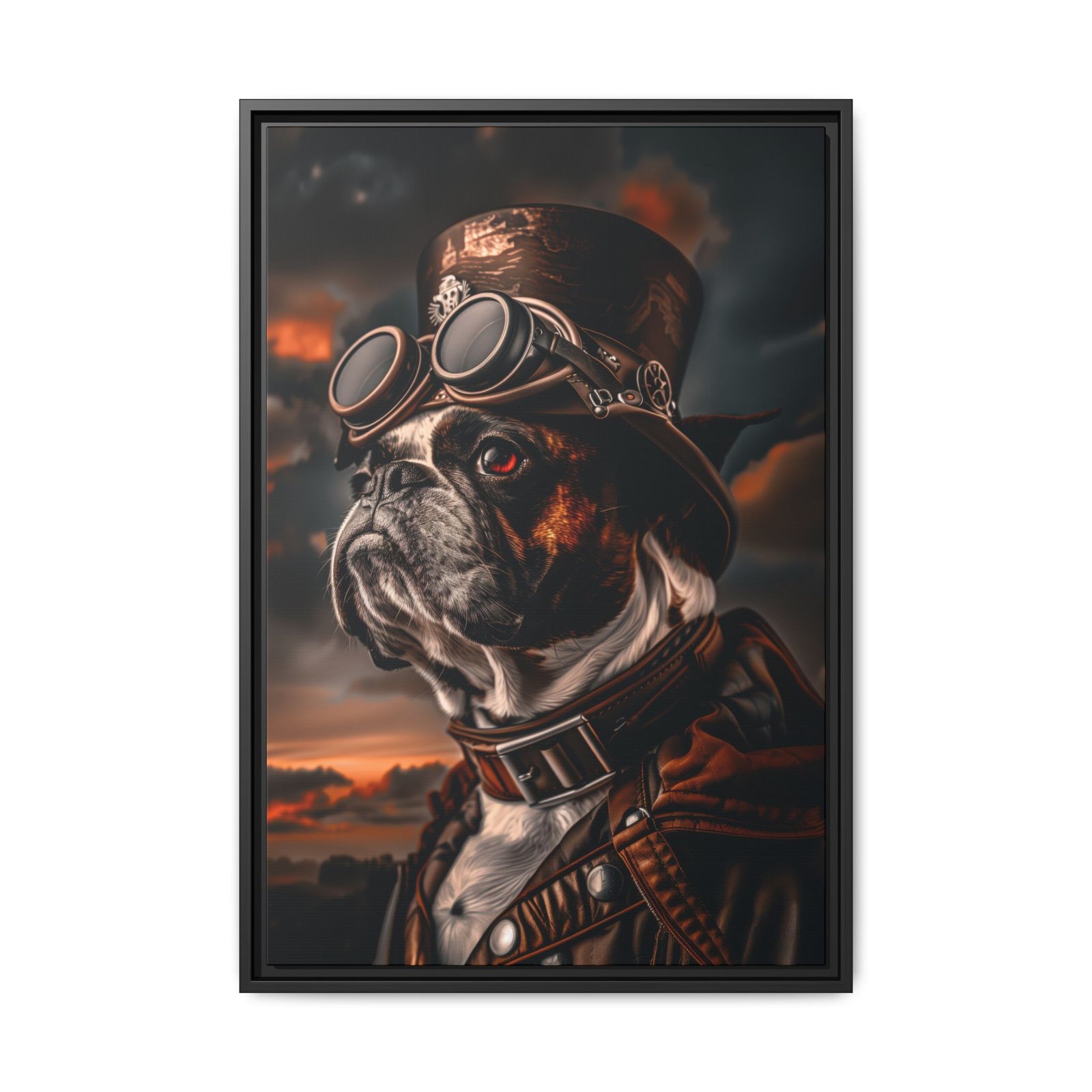 Printed with archival pigment ink on semi-gloss photo paper or available as a framed canvas, this artwork delivers sharp detail, rich contrast, and long-lasting quality. A perfect choice for Boston Terrier owners, dog lovers, or anyone looking to add a bold and distinctive steampunk-inspired piece to their décor.