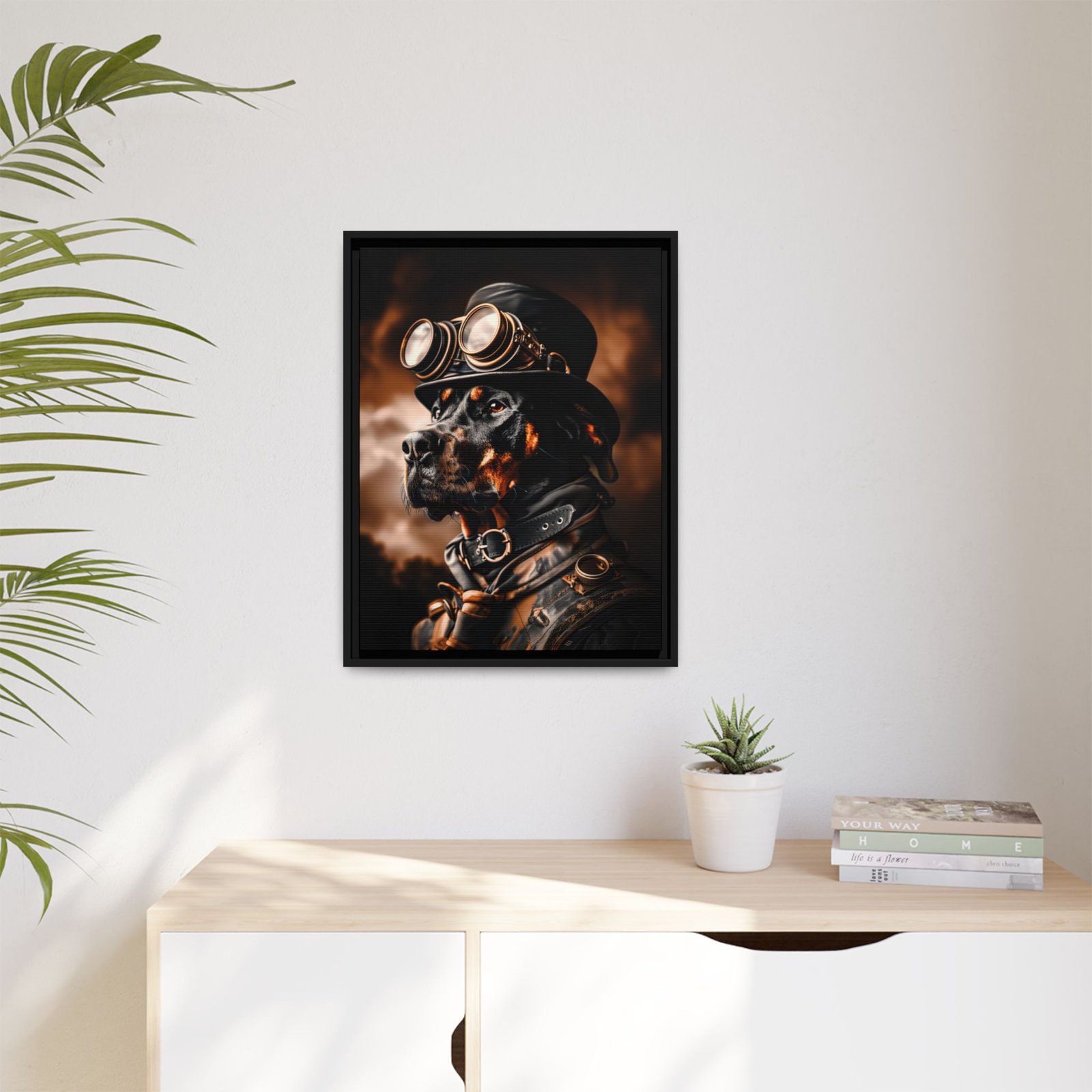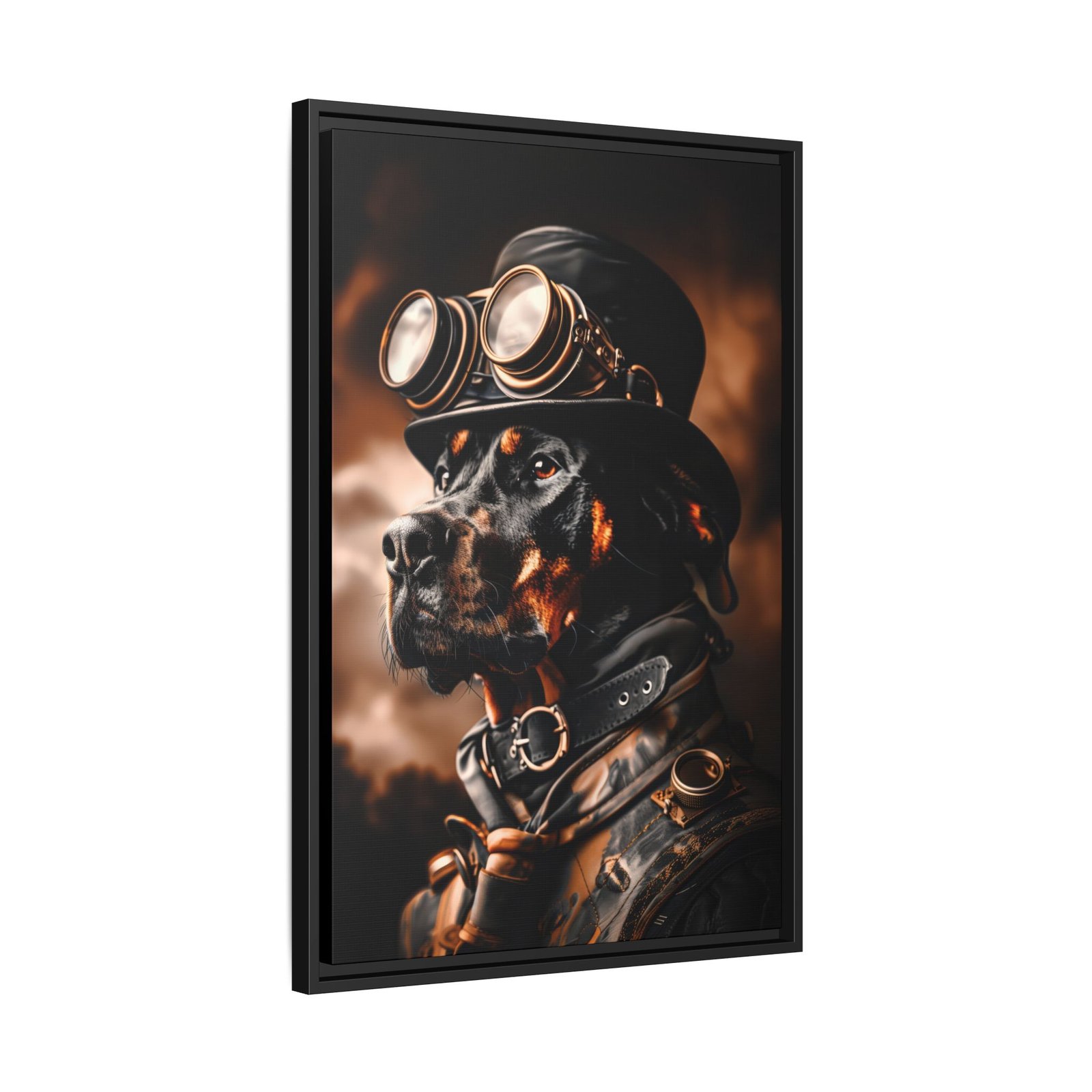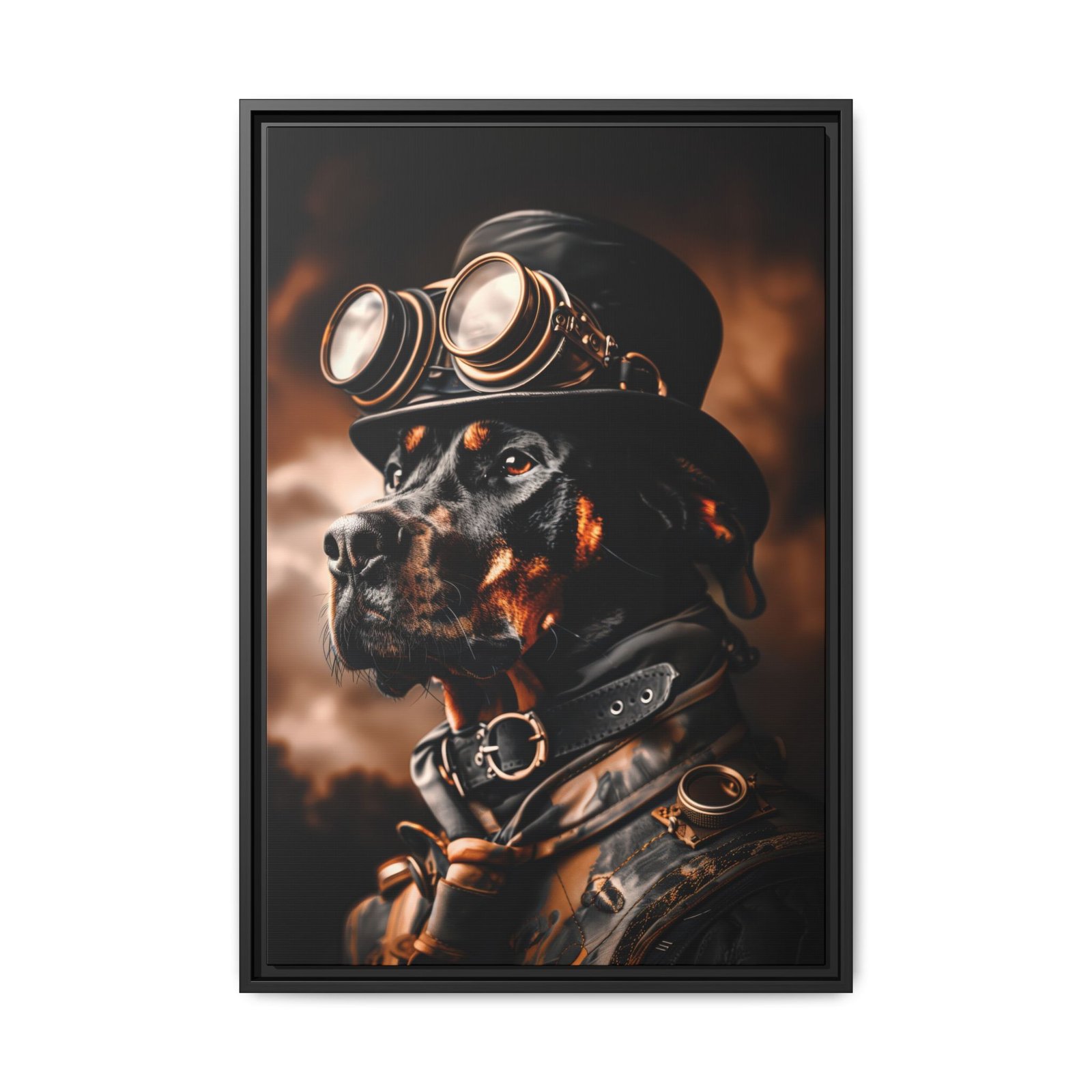 Printed with archival pigment ink on semi-gloss photo paper or available as a framed canvas, this artwork delivers sharp detail, rich contrast, and long-lasting quality. A perfect choice for Doberman owners, dog lovers, or anyone looking to add a bold and distinctive steampunk-inspired piece to their décor.