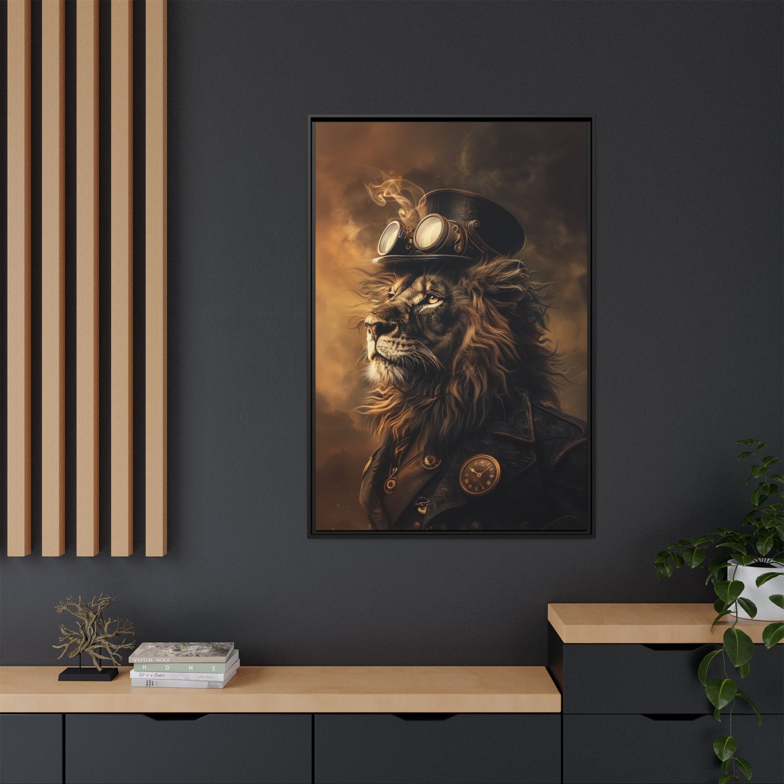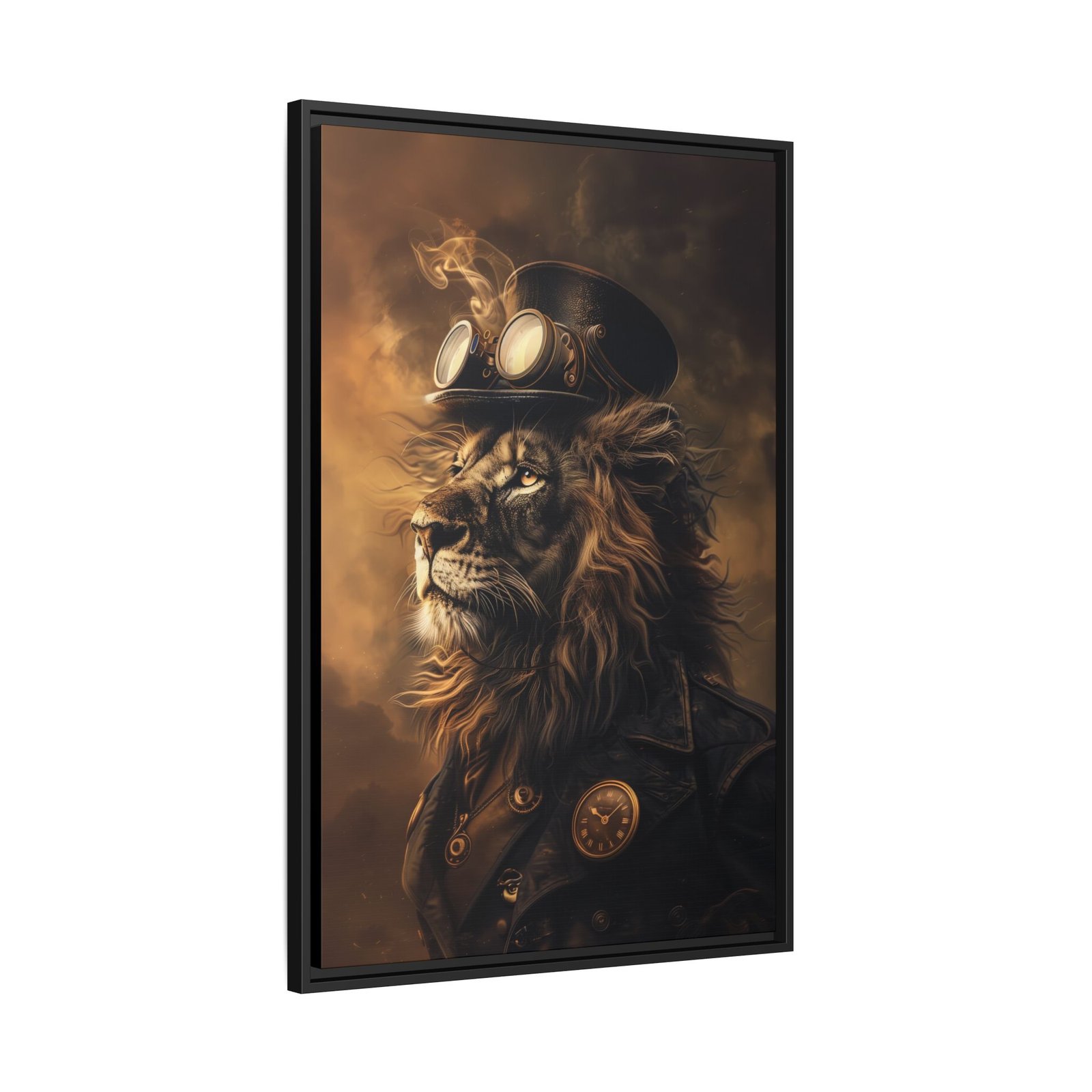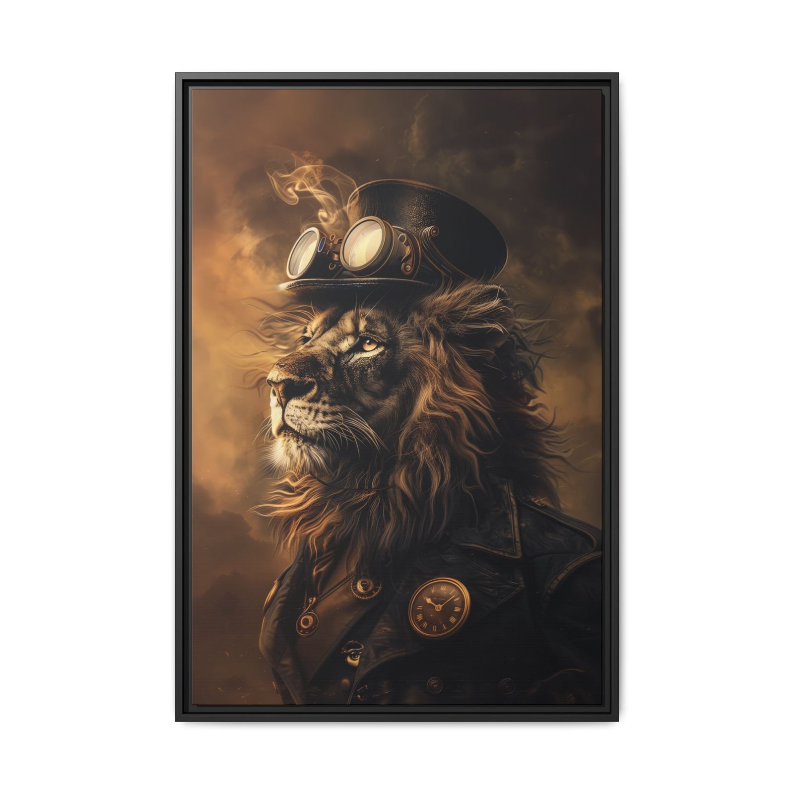 A bold steampunk lion portrait featuring vintage goggles, rich sepia tones, and industrial elegance. Perfect for adding character to offices, studios, or modern rustic spaces.