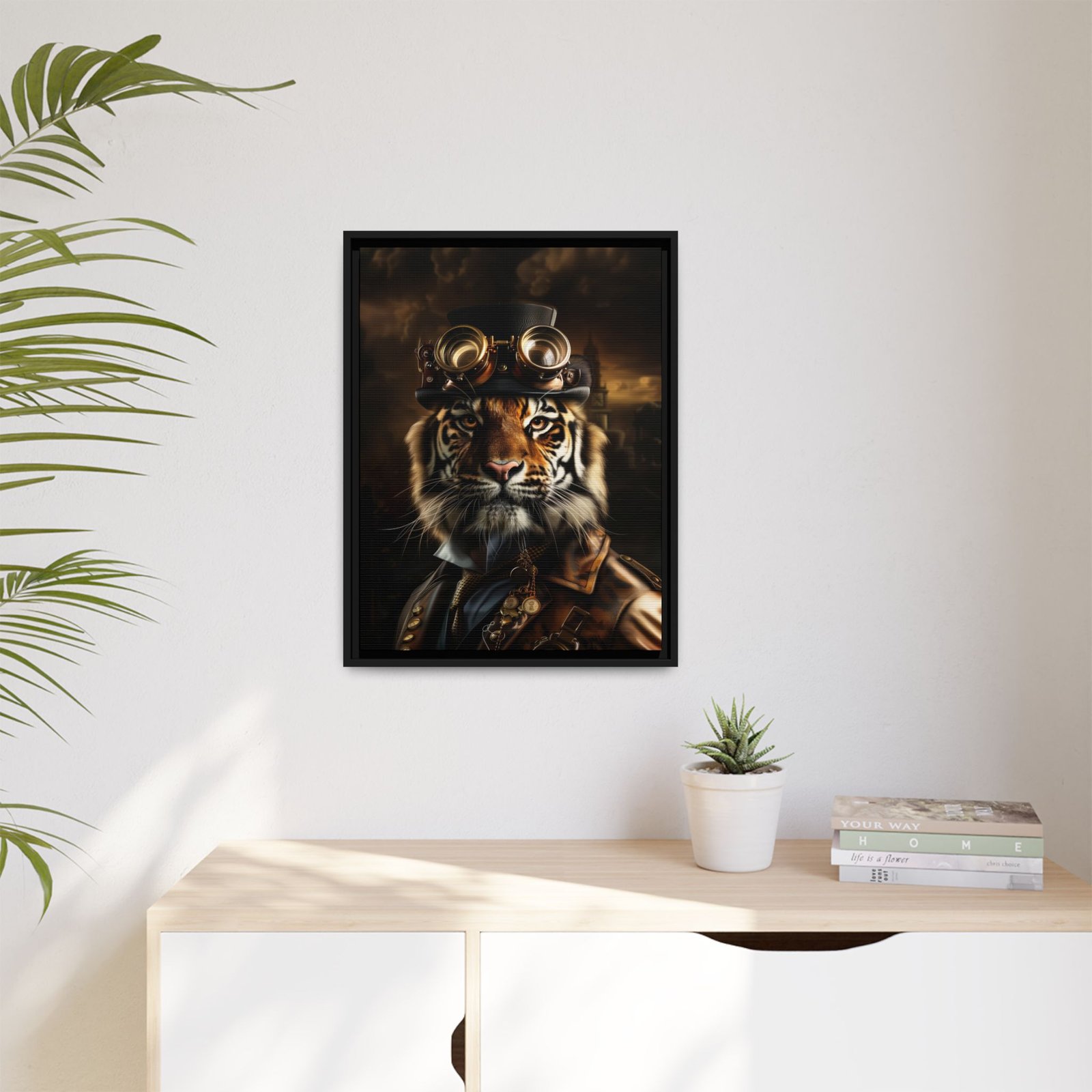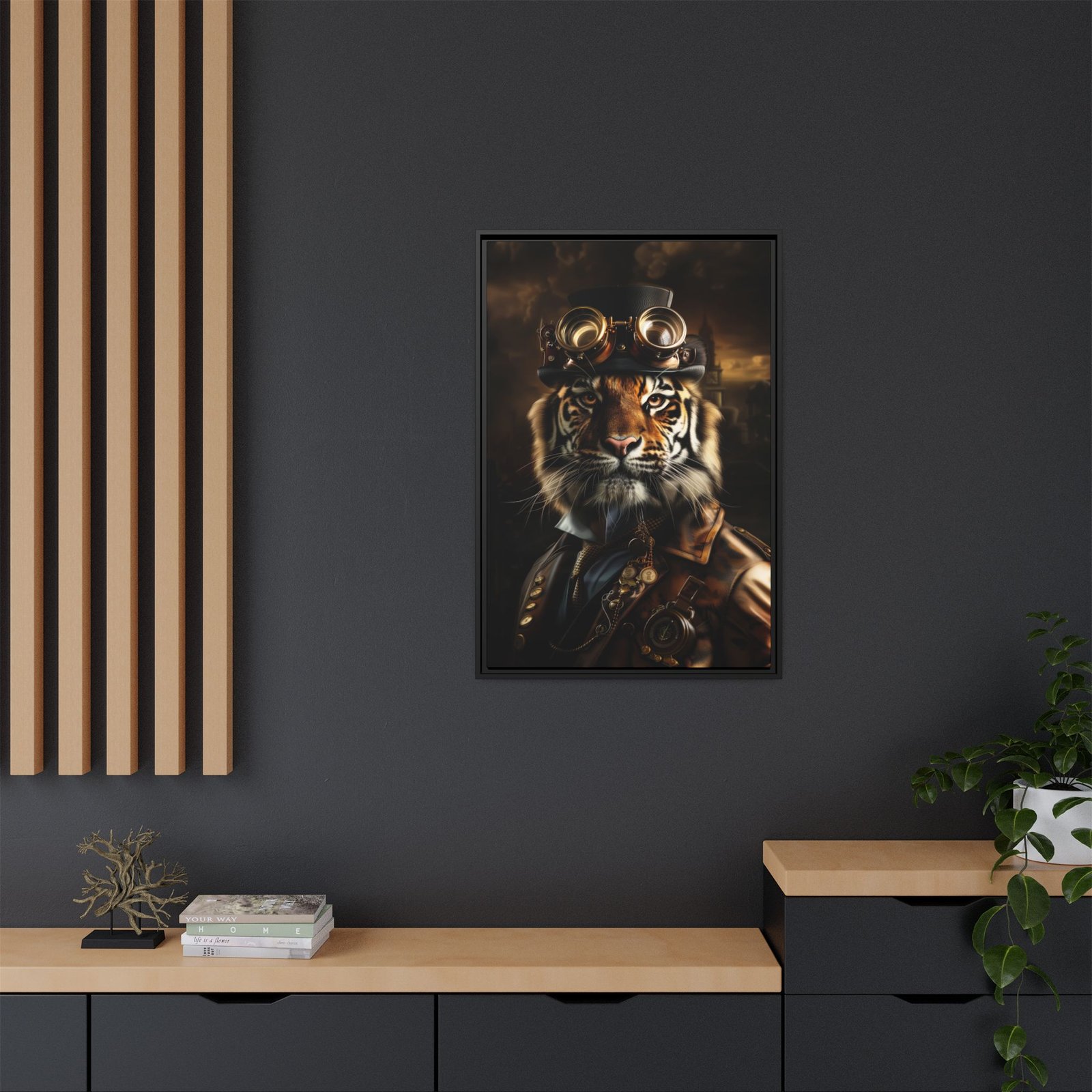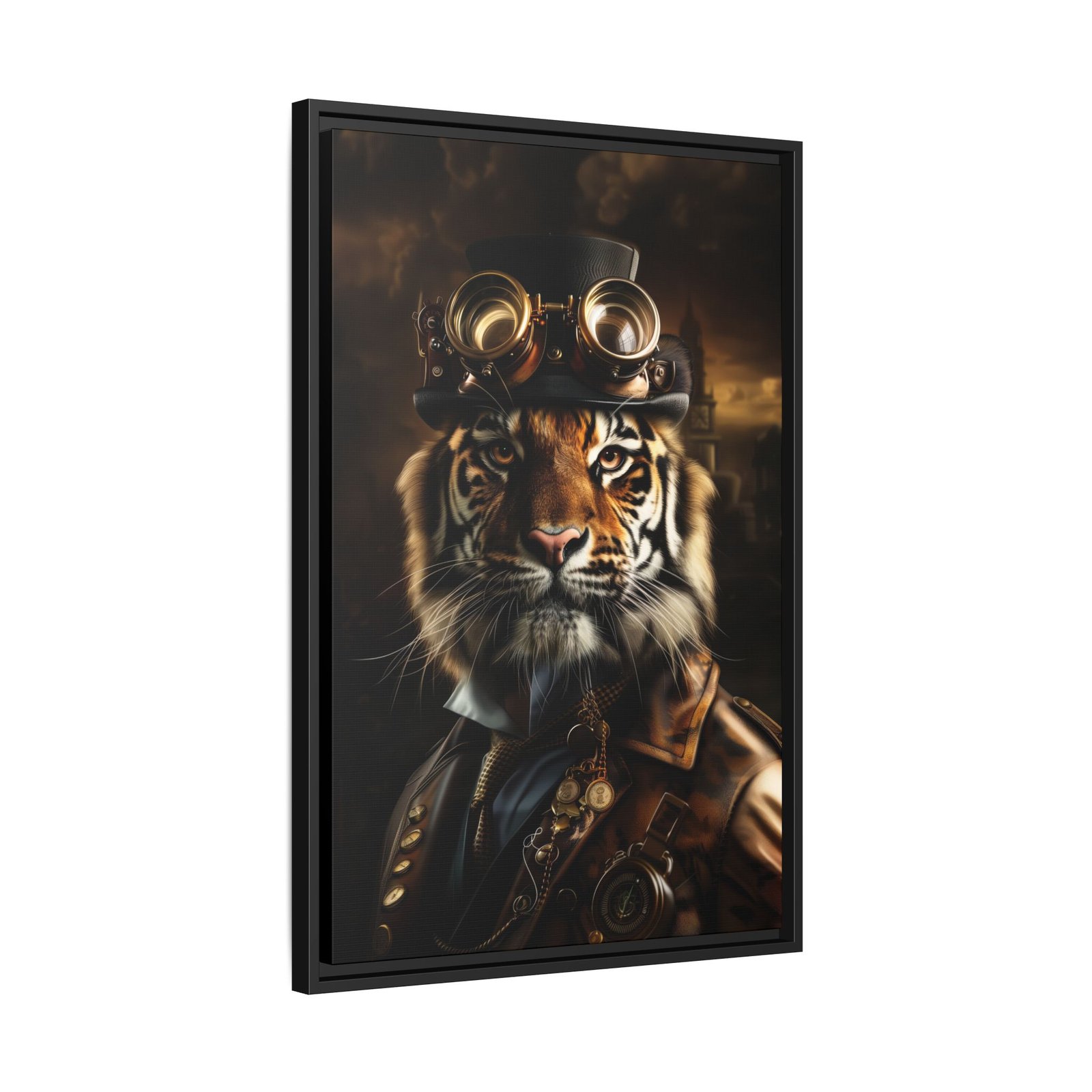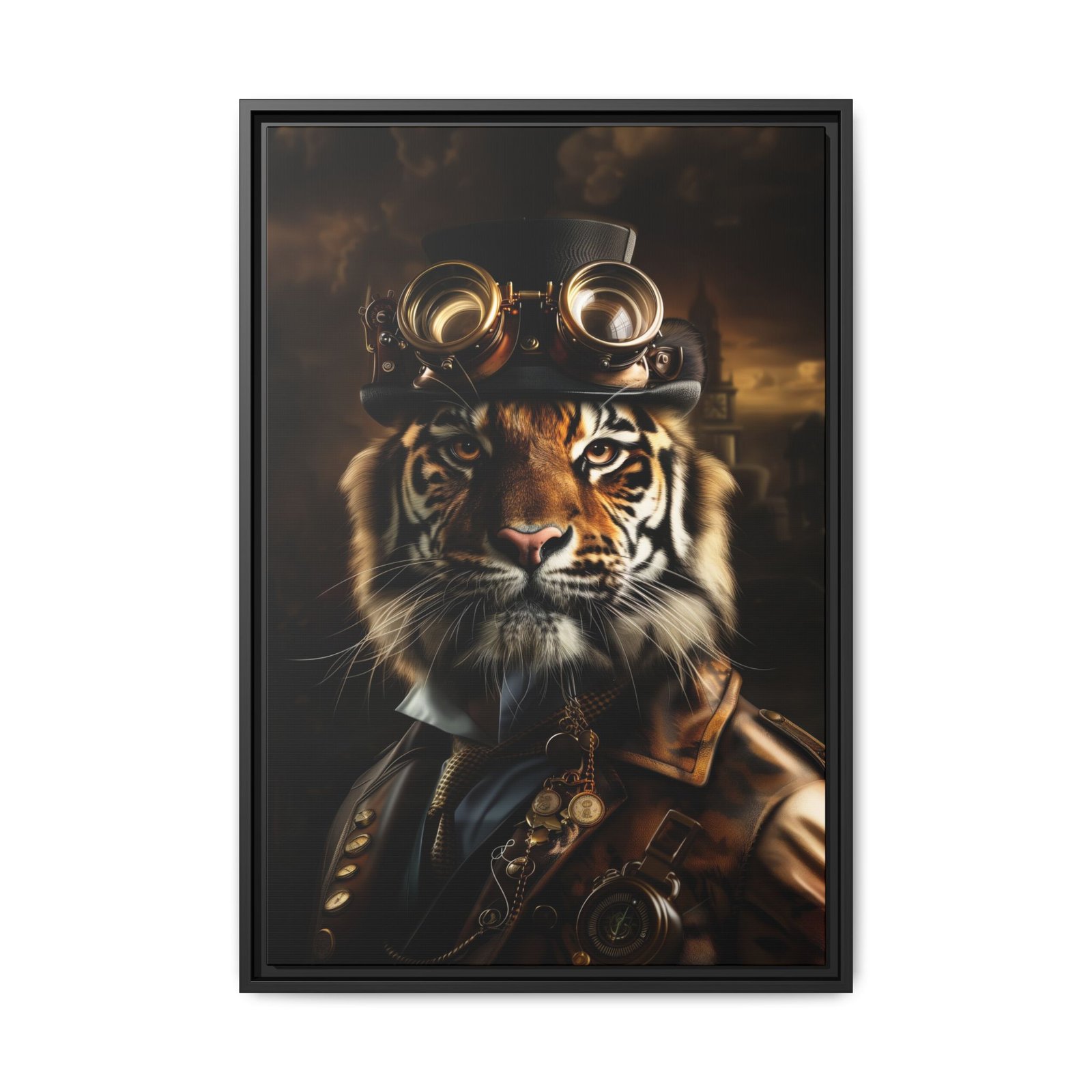 Add intensity and character to your space with this striking steampunk tiger wall art. Featuring a fierce tiger adorned with vintage goggles and refined industrial details, this piece blends bold wildlife imagery with classic steampunk style.