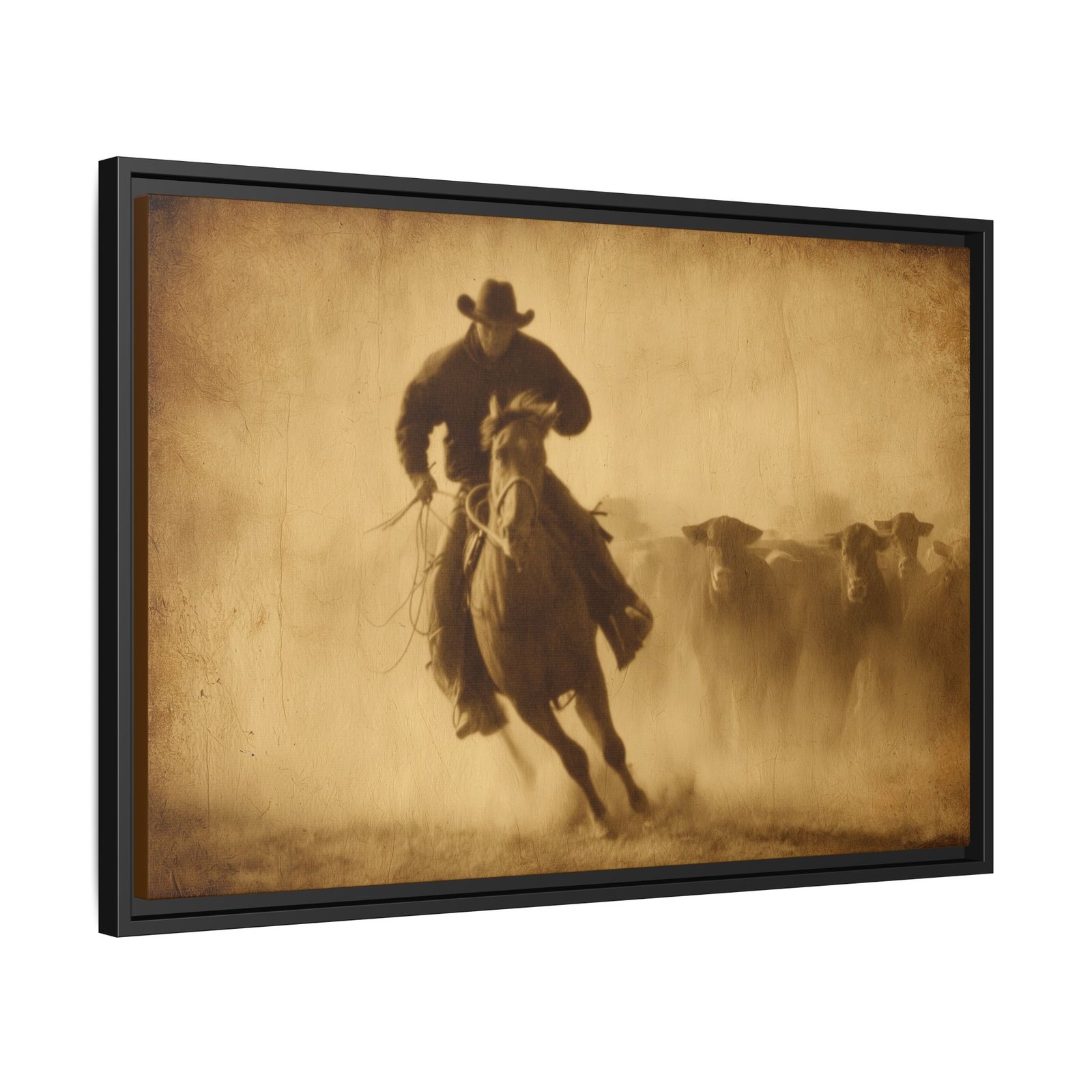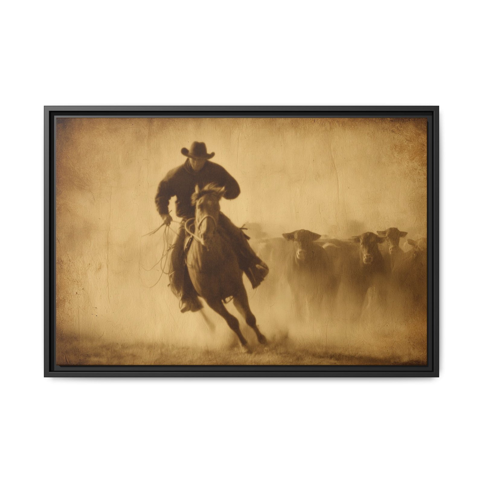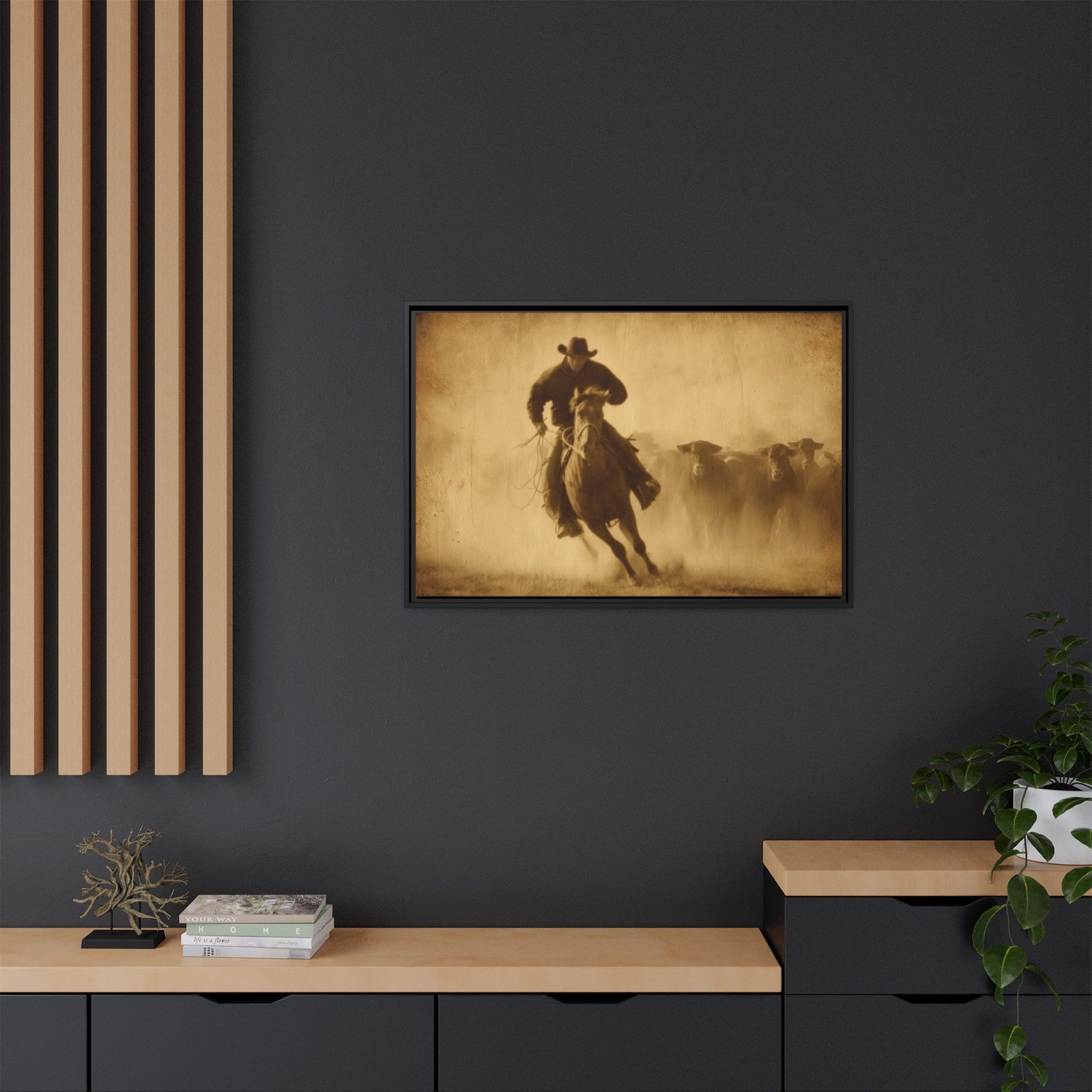This vintage cowboy wall art captures the raw energy of the American West, featuring a lone rider driving cattle through a cloud of dust. The motion-filled composition and sepia tones create a timeless, rugged atmosphere that reflects the spirit of frontier life.
