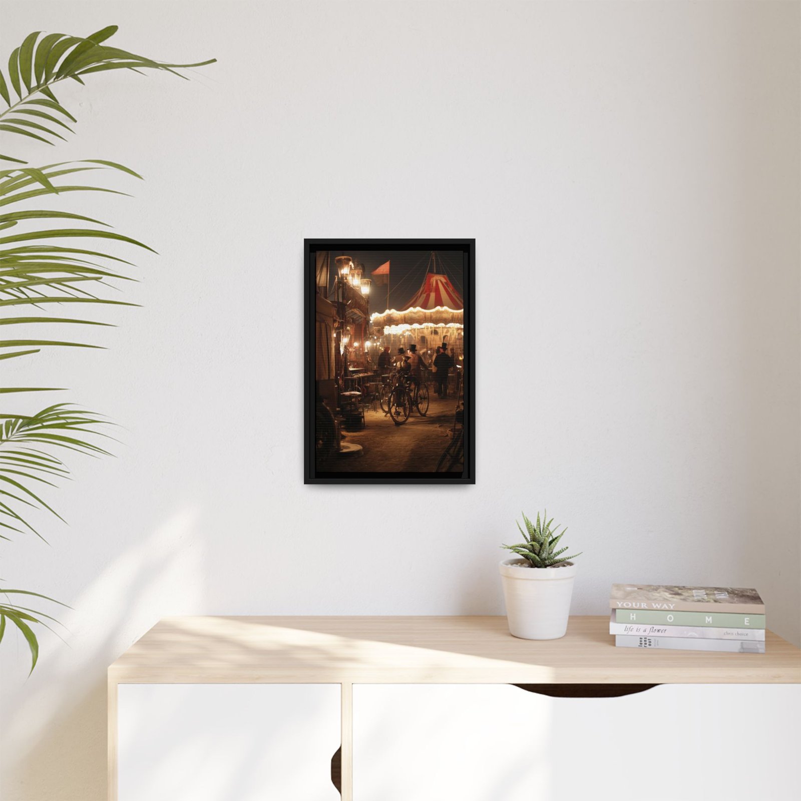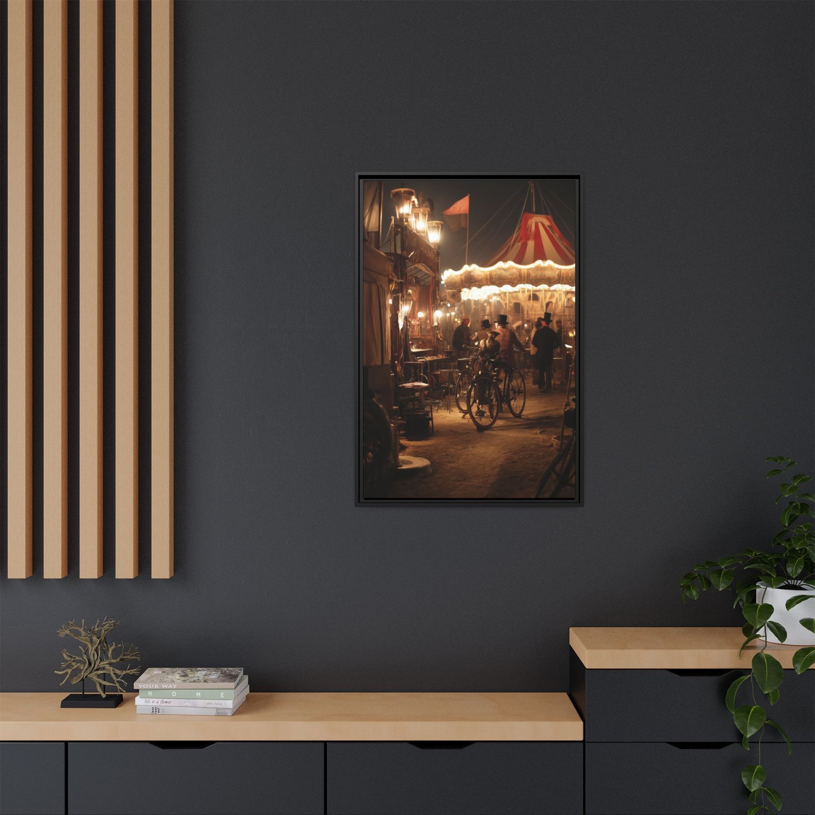 The warm lighting and rich tones create a nostalgic, cinematic atmosphere, making it an ideal focal point for living rooms, offices, or creative spaces. The blend of vintage fairground elements and subtle steampunk influence gives this piece a timeless and immersive quality.