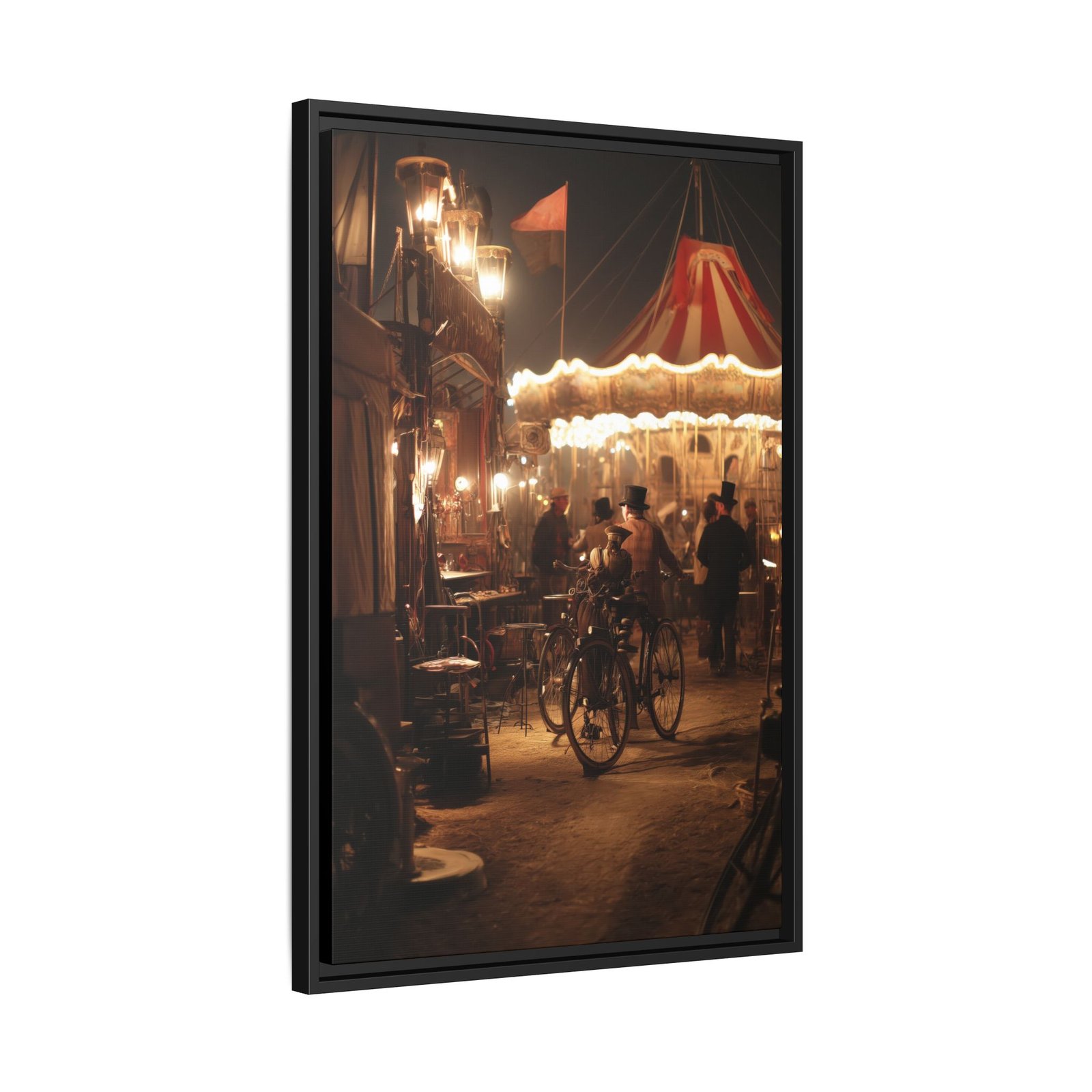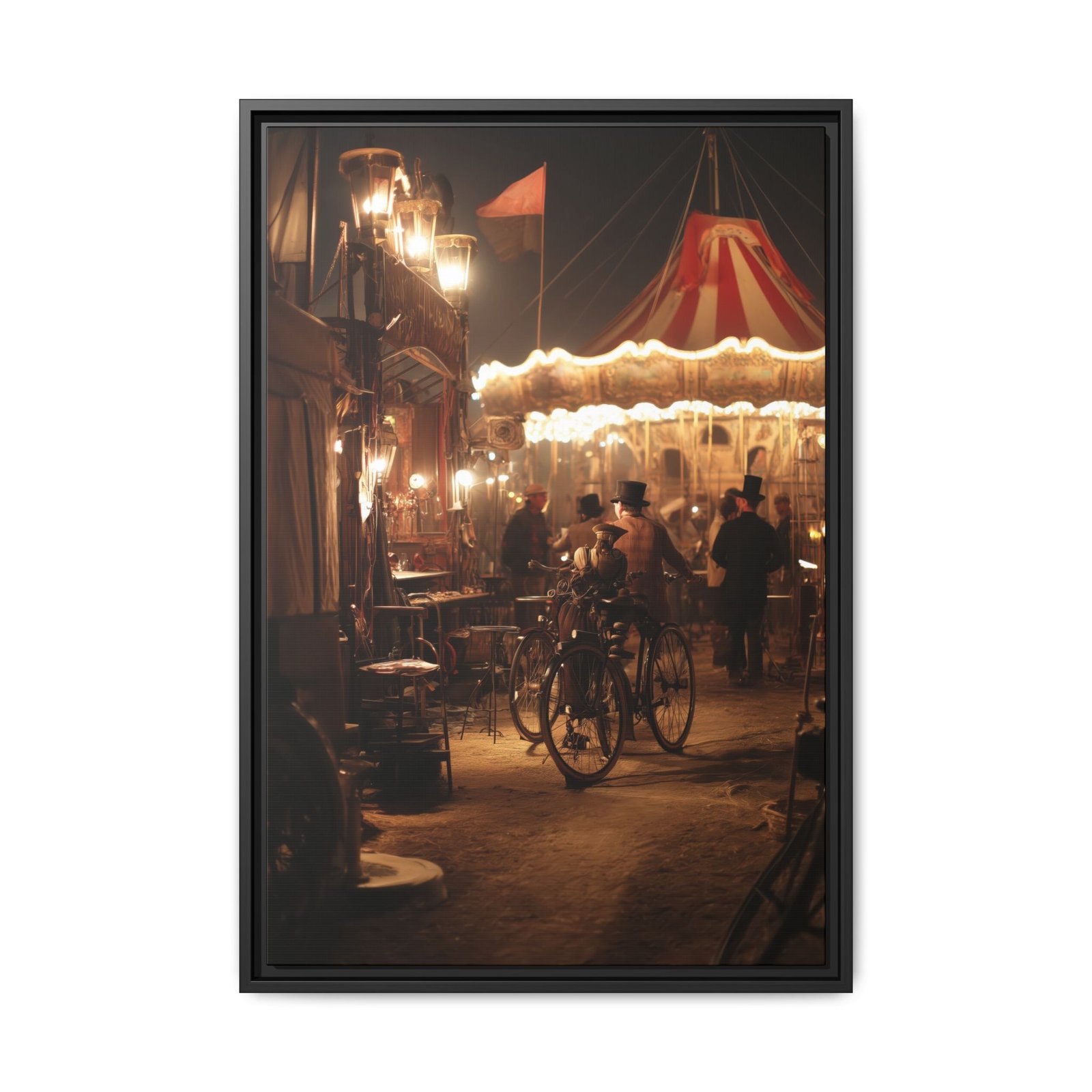 Step into a world of vintage charm with this steampunk carnival wall art. This detailed scene captures a softly lit fairground at night, featuring a glowing carousel, antique bicycles, and figures dressed in classic industrial-era style.