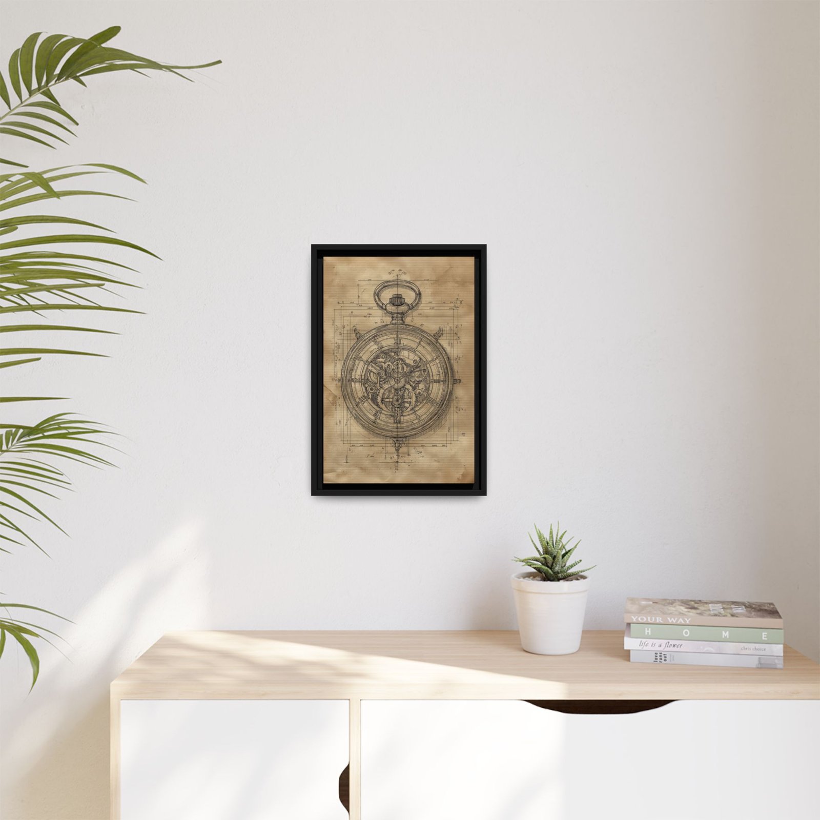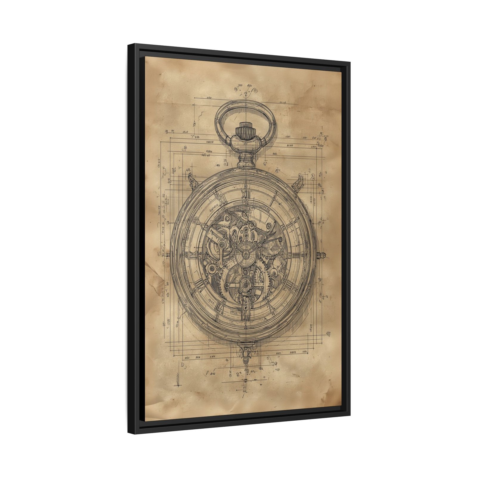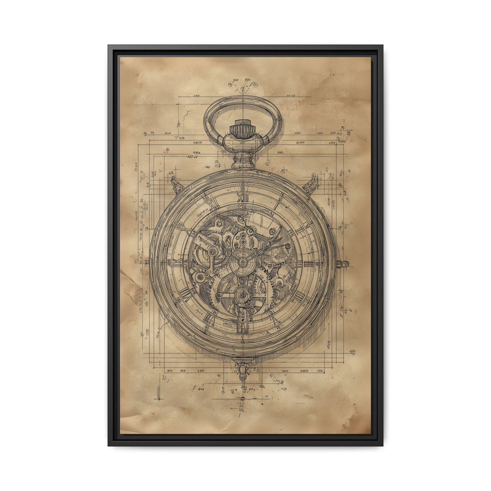 Add a touch of precision and vintage design to your space with this stopwatch blueprint wall art. This detailed technical illustration showcases the inner mechanics of a classic pocket watch, rendered in a timeless sepia tone that enhances its antique aesthetic.
