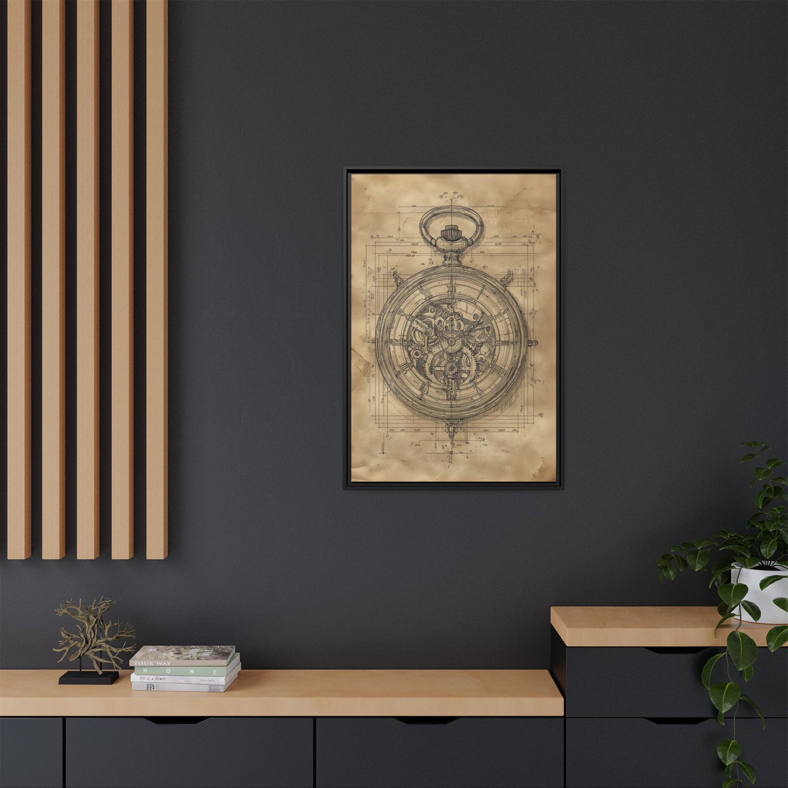 The clean linework and layered mechanical details create a balanced and visually engaging composition, making it an ideal focal point for offices, workshops, or industrial-style interiors. Its blend of engineering and artistry gives the piece a refined, intellectual feel.