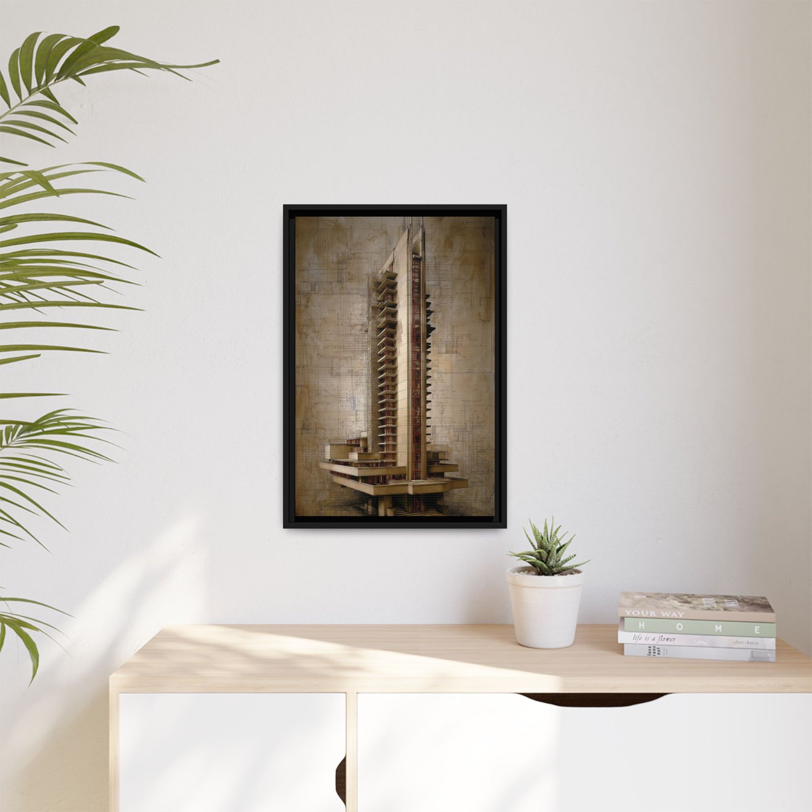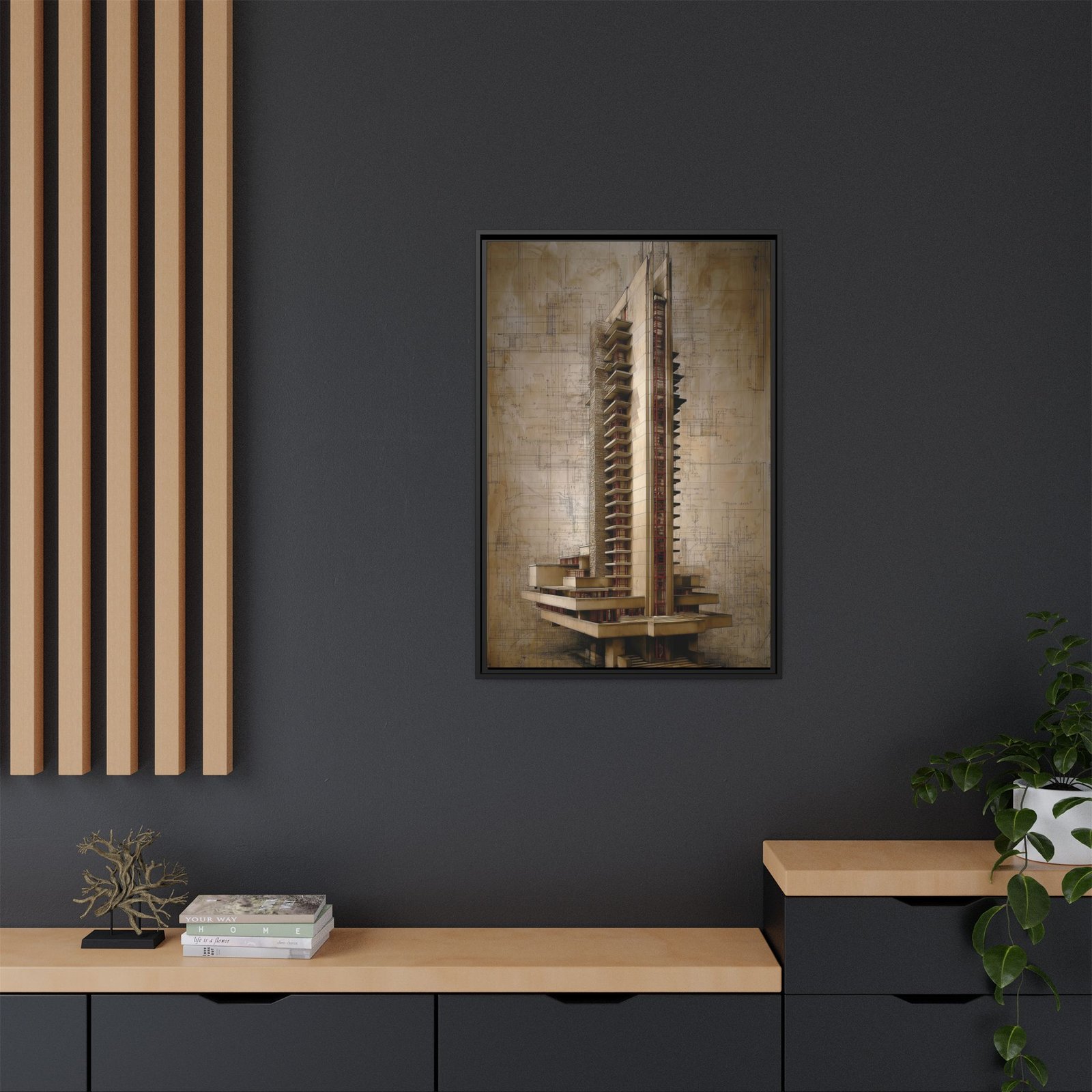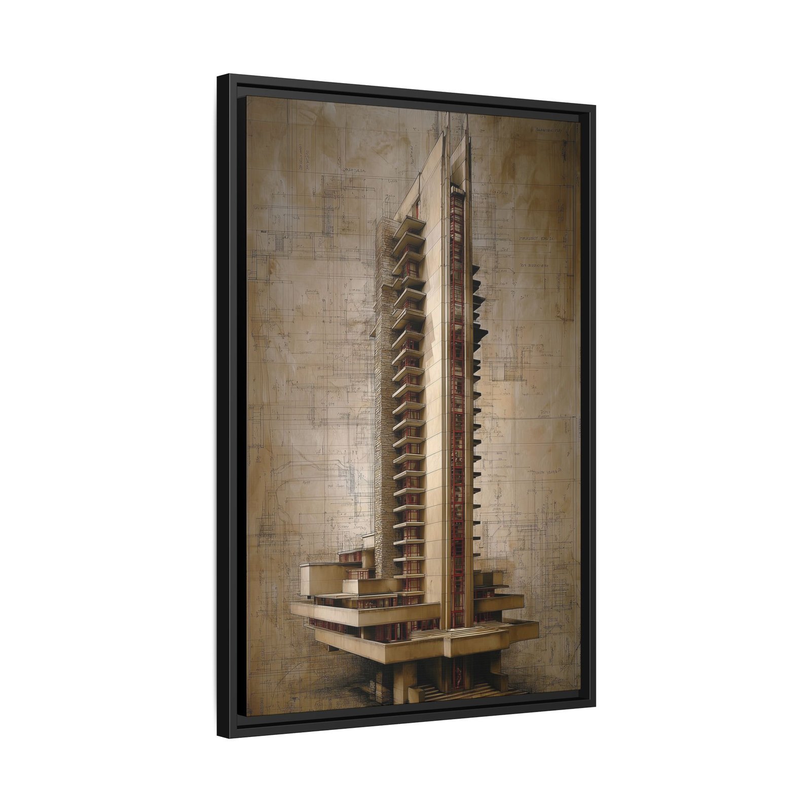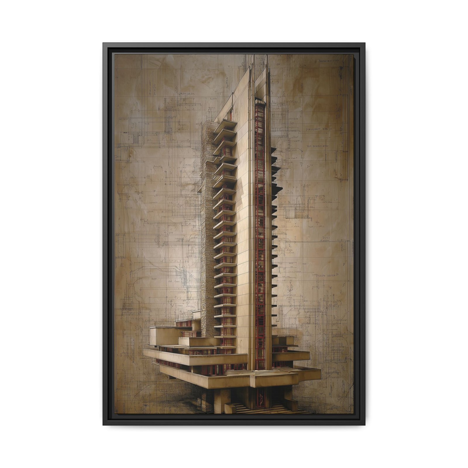 This architectural wall art showcases a striking skyscraper design inspired by the visionary style of Frank Lloyd Wright. The structure rises with bold vertical emphasis, featuring layered terraces, clean geometric lines, and a strong central spine that draws the eye upward. The composition blends modernist architecture with a conceptual blueprint aesthetic, creating a piece that feels both engineered and artistic.